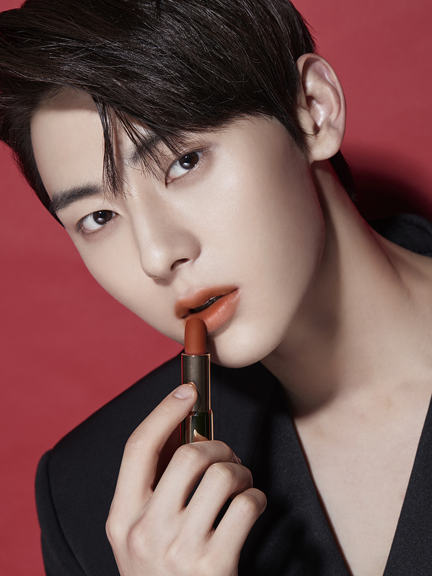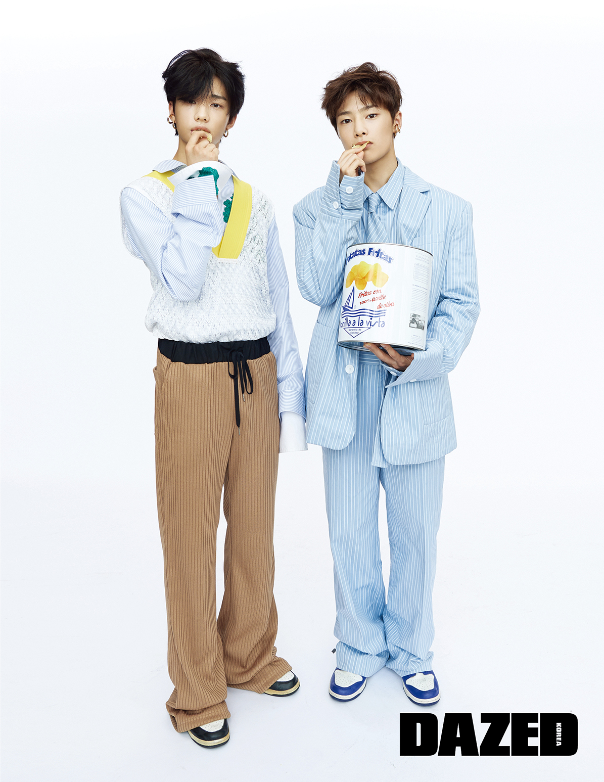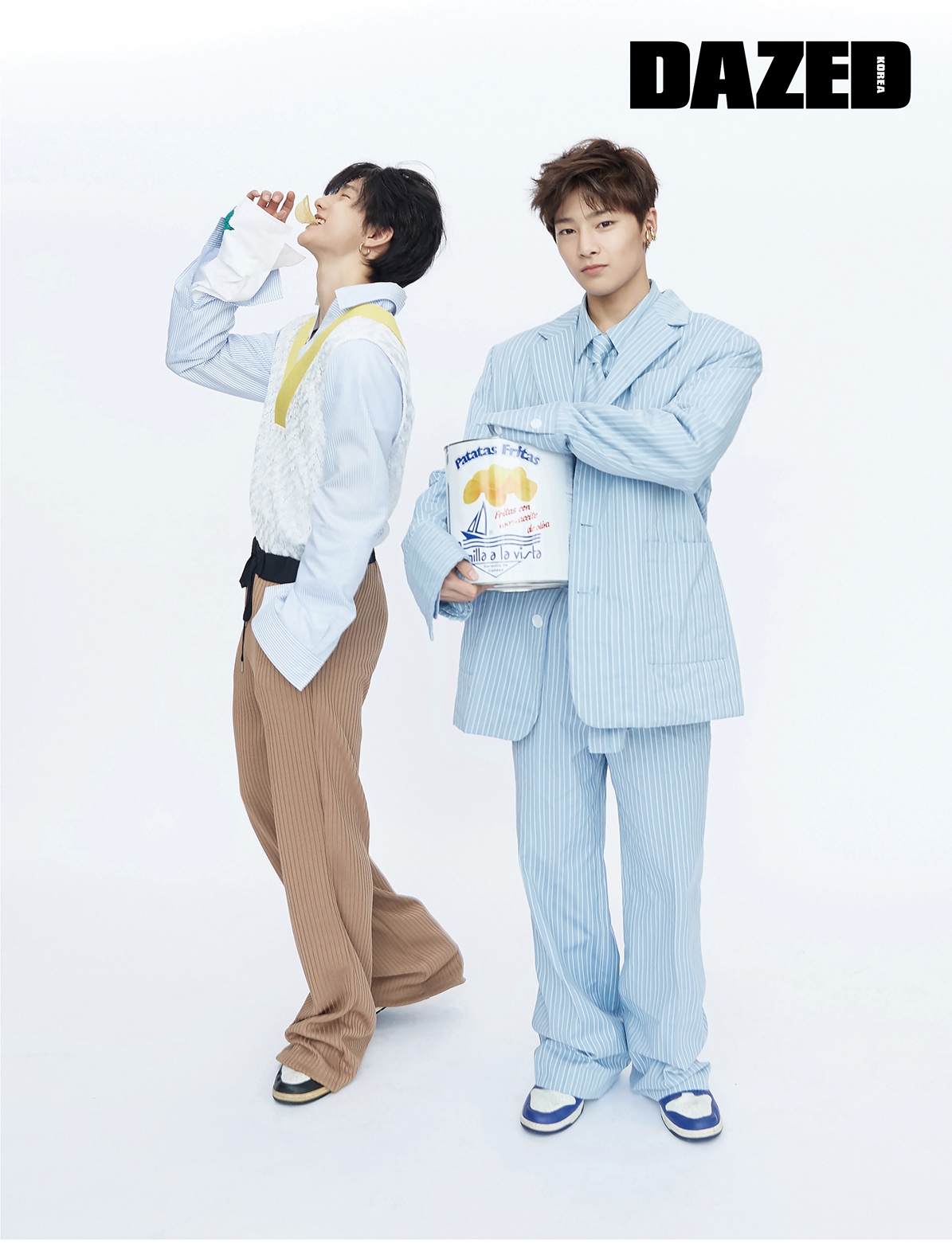현진이 입고 신은 레드 숄칼라 재킷, 첼시 부츠는 오디너리 피플(Ordinary People), 이너로 입은 니트 베스트는 얼킨(Ul:Kin), 베이지 컬러 와이드 팬츠는 김서룡(Kimseoryong), 이어링은 포트레이트 리포트(Portrait Report), 아이엔이 입은 그레이 컬러 실크 셔츠, 스트라이프 팬츠는 김서룡(Kimseoryong), 이너로 입은 터틀넥 베스트는 코스(COS), 첼시 부츠는 오디너리 피플(Ordinary People), 이어링은 포트레이트 리포트(Portrait Report).