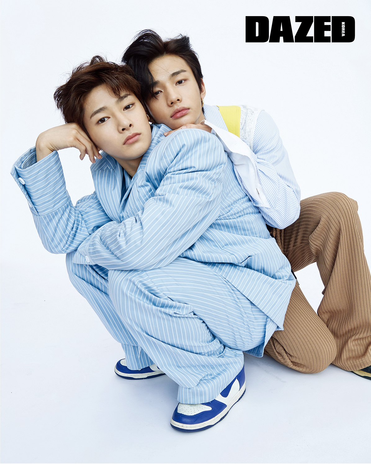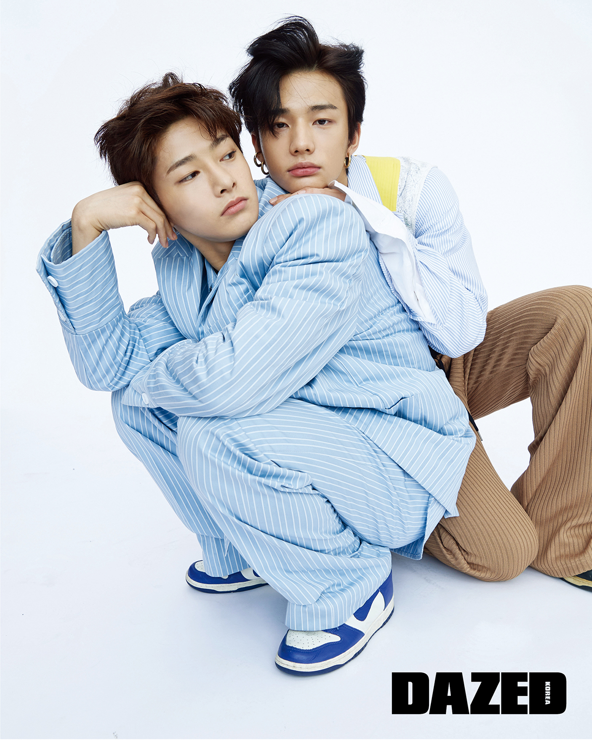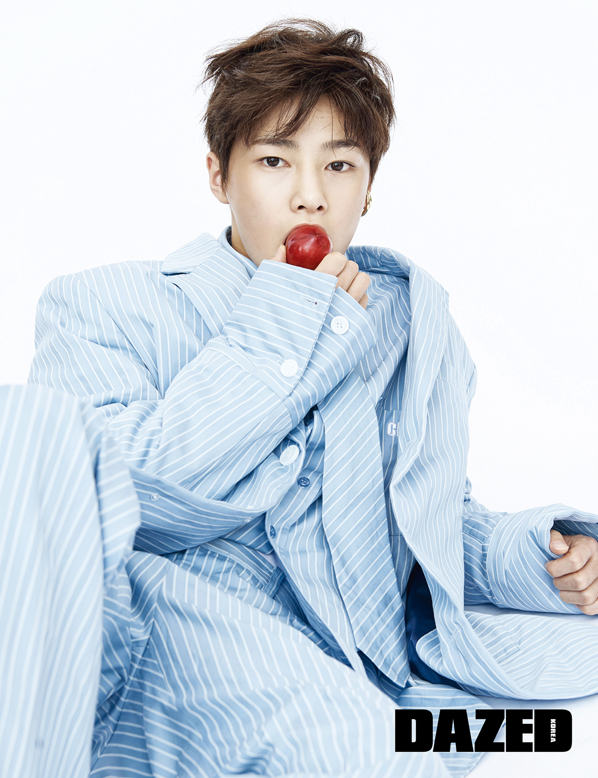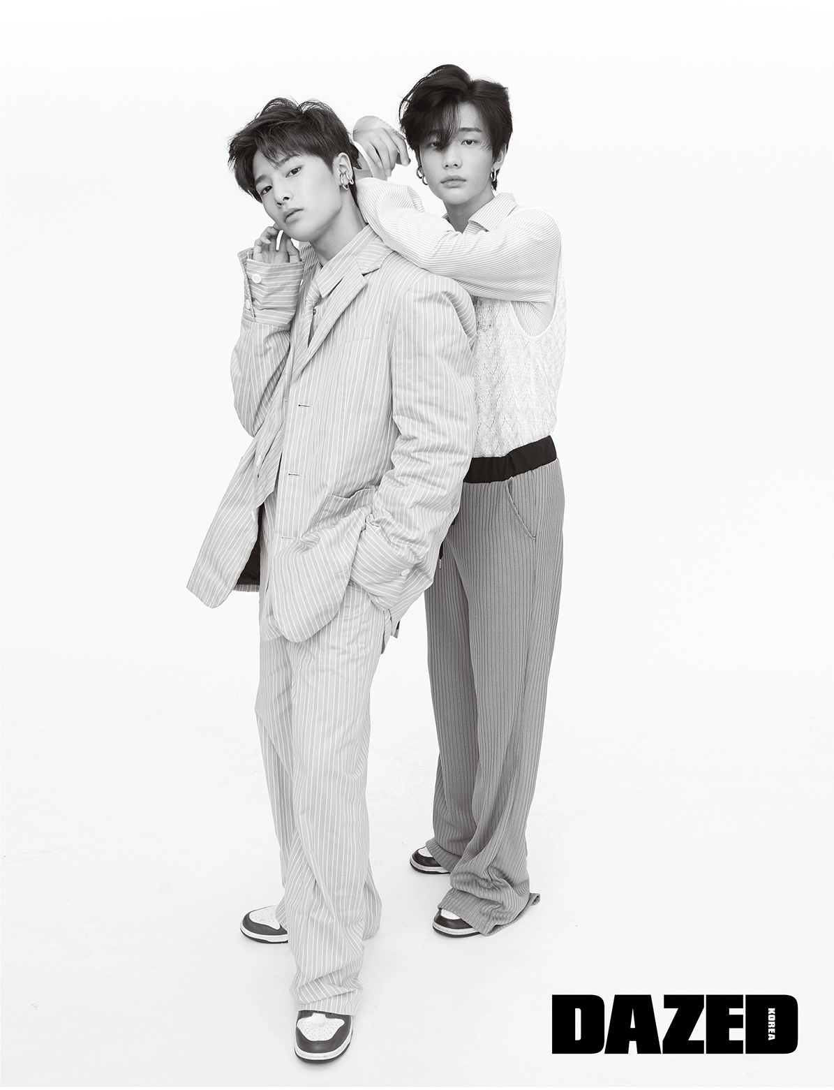 아이엔이 입은 스트라이프 재킷, 셔츠 팬츠, 타이는 모두 참스(Charm’s), 신발은 나이키(Nike), 이어링은 포트레이트 리포트(Portrait Report).
