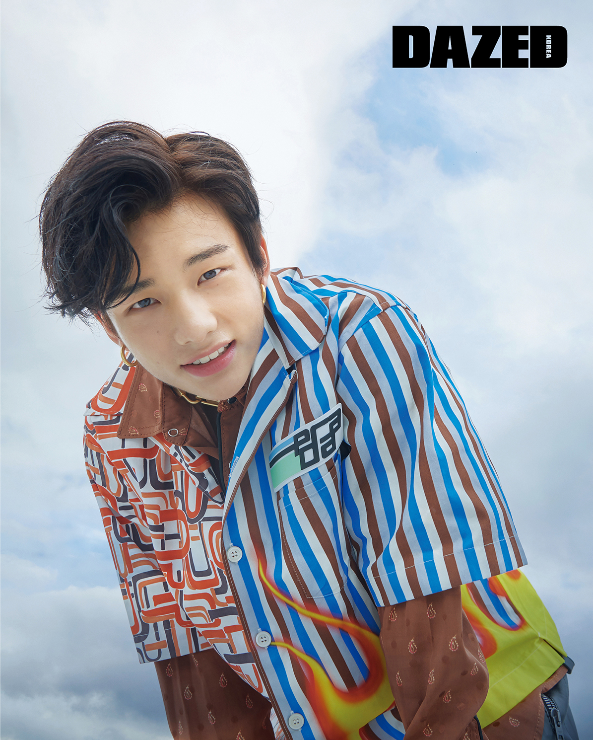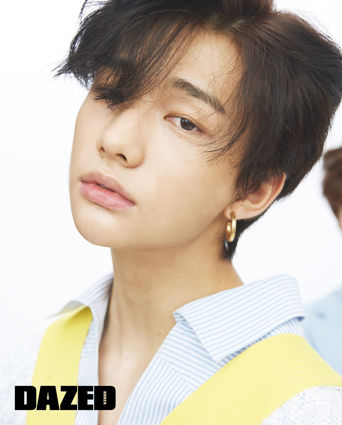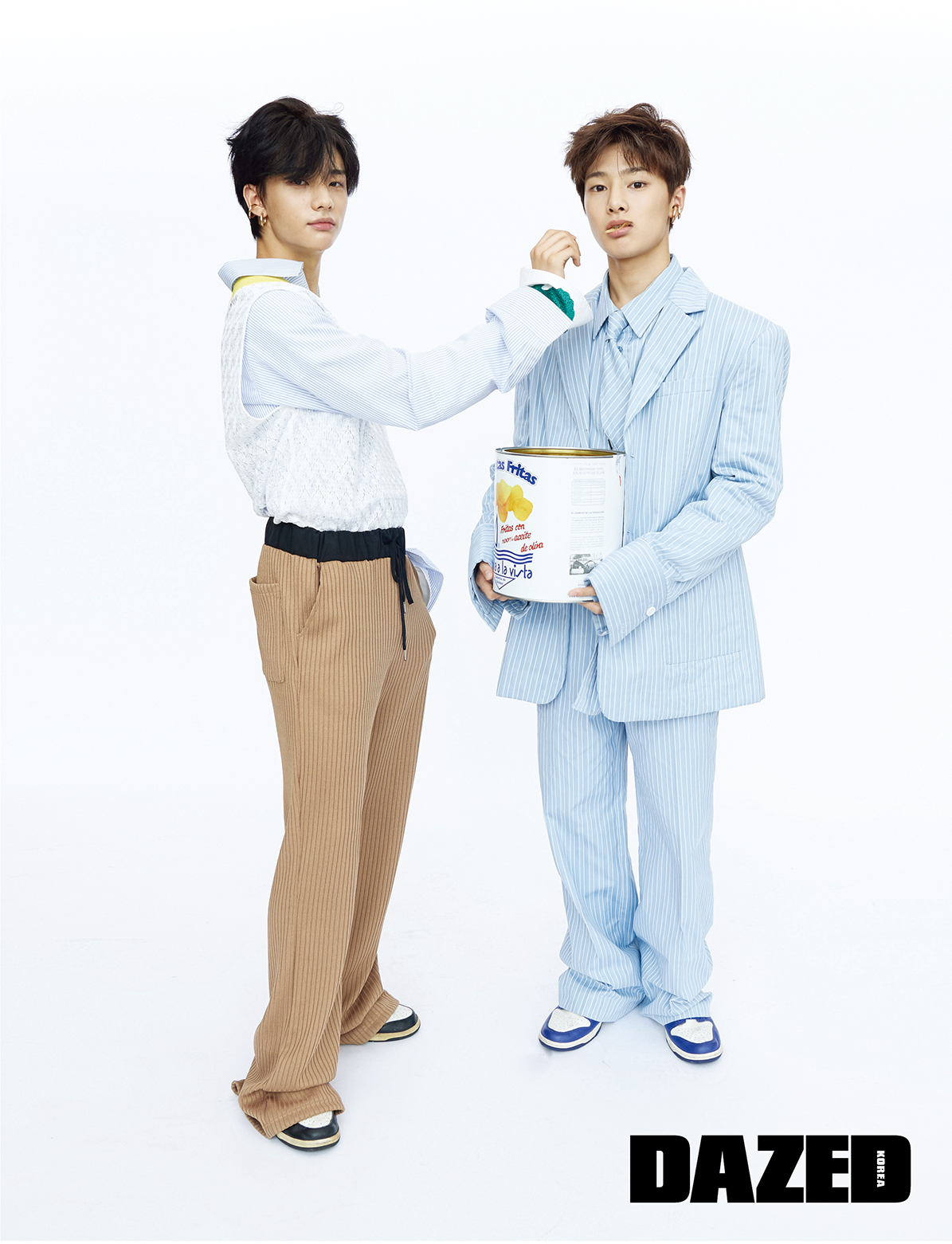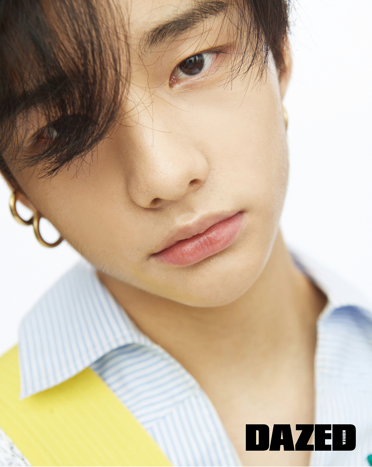 아이엔이 입은 스트라이프 재킷, 셔츠 팬츠, 타이는 모두 참스(Charm’s), 신발은 나이키(Nike), 이어링은 포트레이트 리포트(Portrait Report).