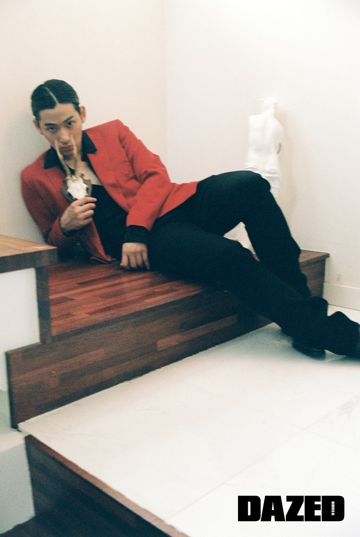 레드 컬러 재킷은 빈티지 제품, 블랙 컬러 실크 셔츠는 김서룡(Kimseoryong), 블랙 컬러 데님 팬츠는 캘빈 클라인 진(Calvin Klein Jeans).