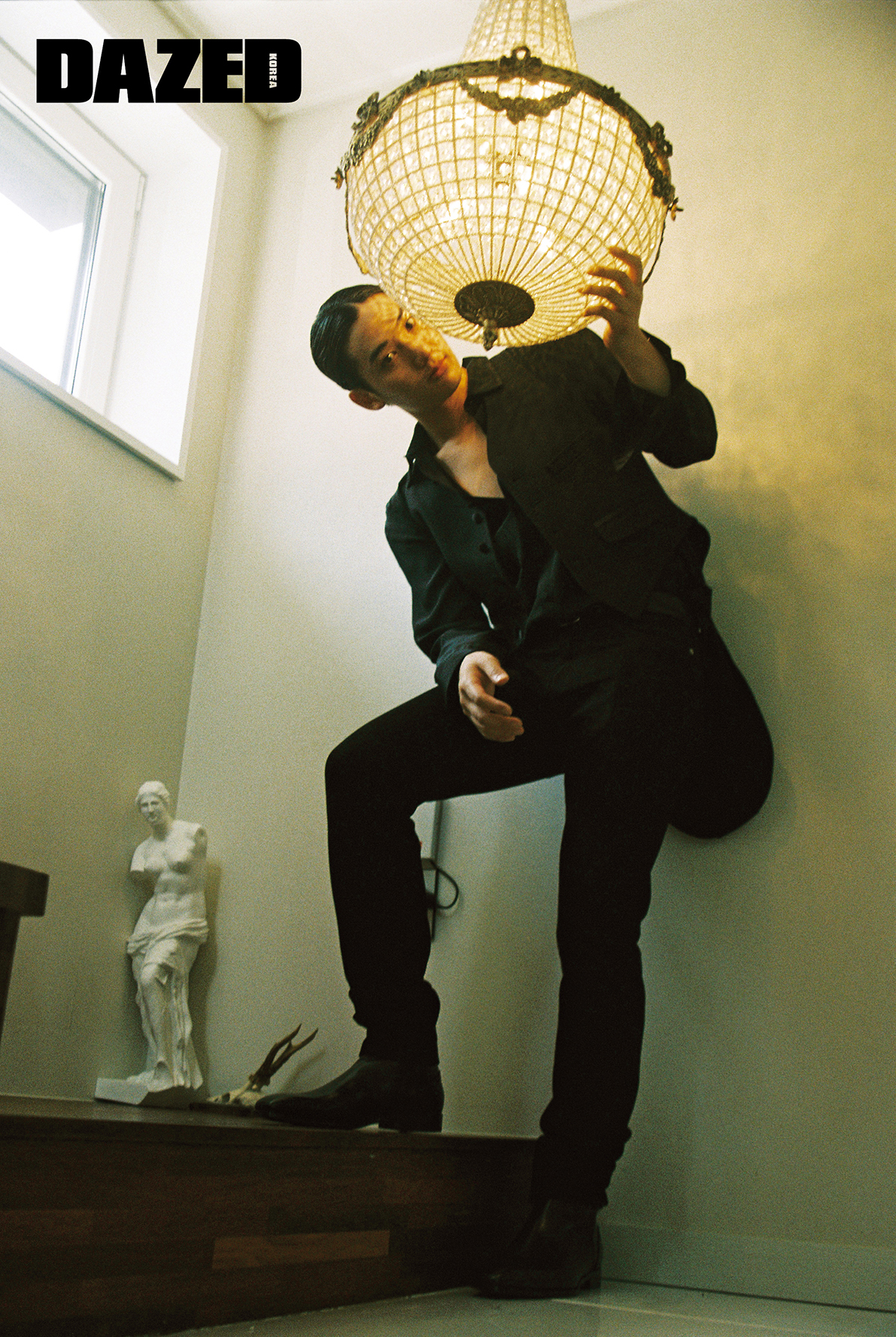 블랙 실크 셔츠는 김서룡(Kimseoryong), 블랙 데님 팬츠는 캘빈 클라인 진(Calvin Klein Jeans), 롱 베스트는 빈티지 제품, 슈즈는 에르메네질도 제냐(Ermenegildo Zegna).