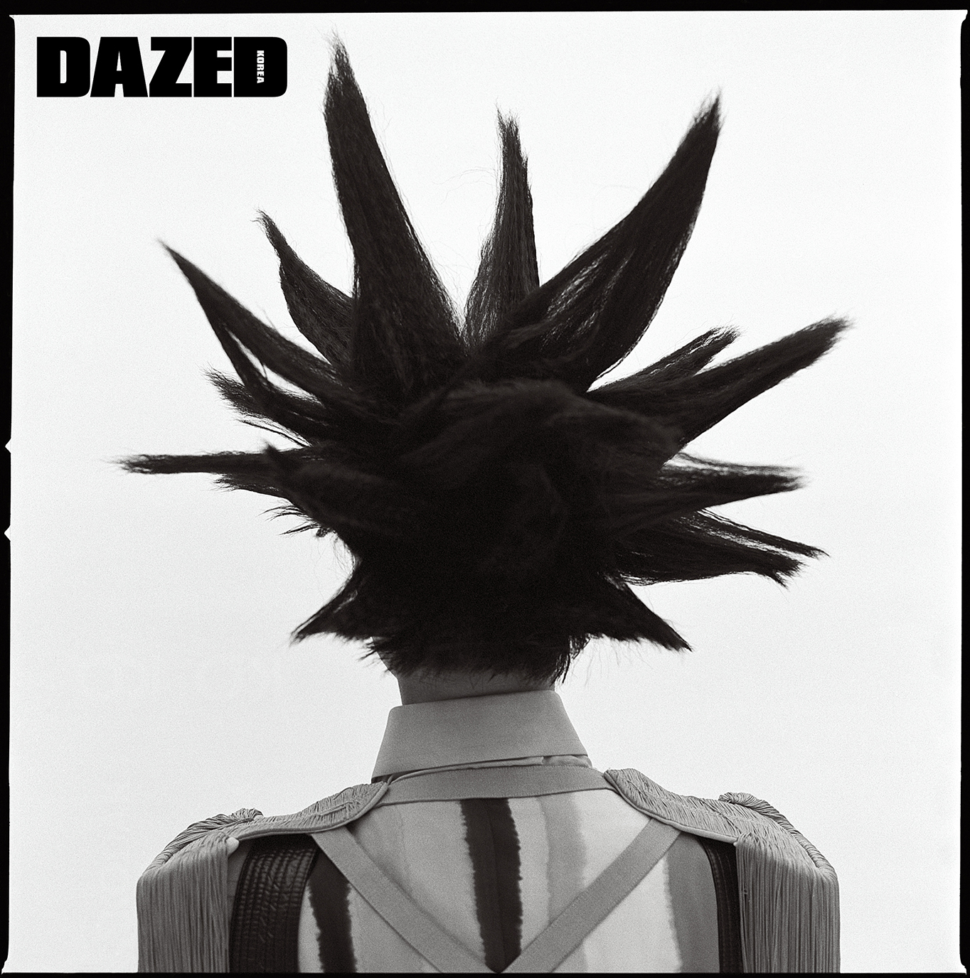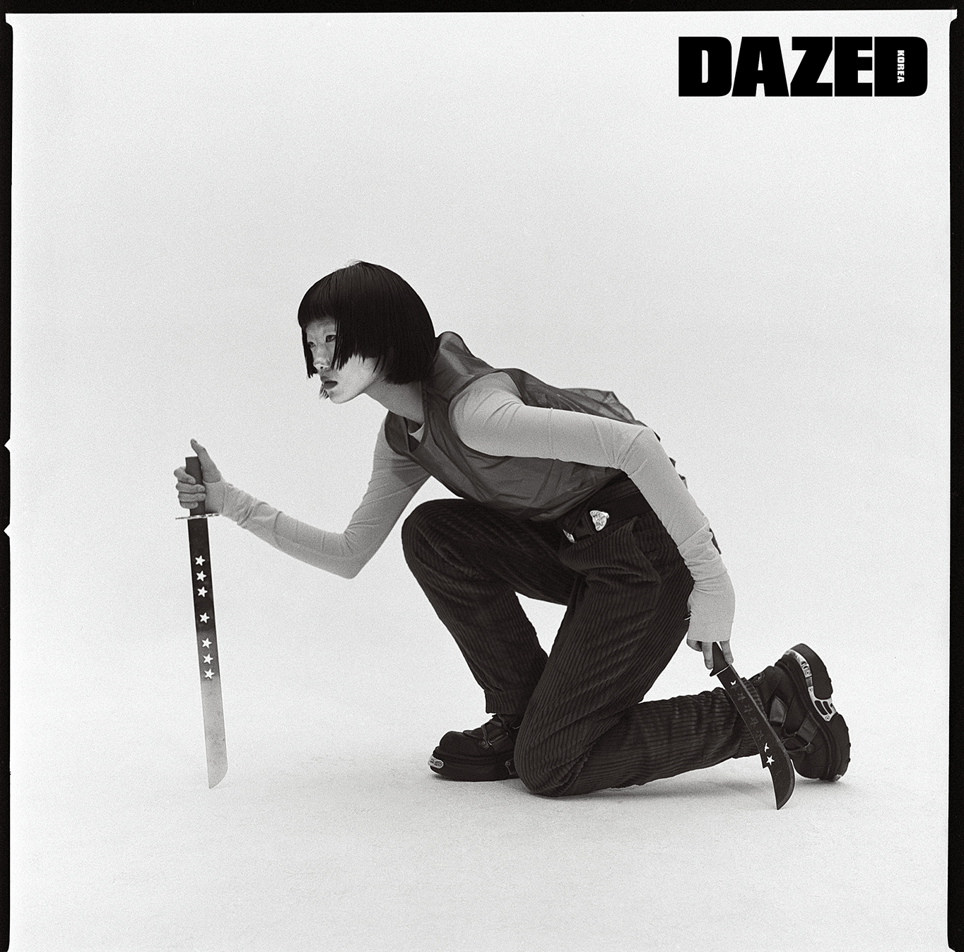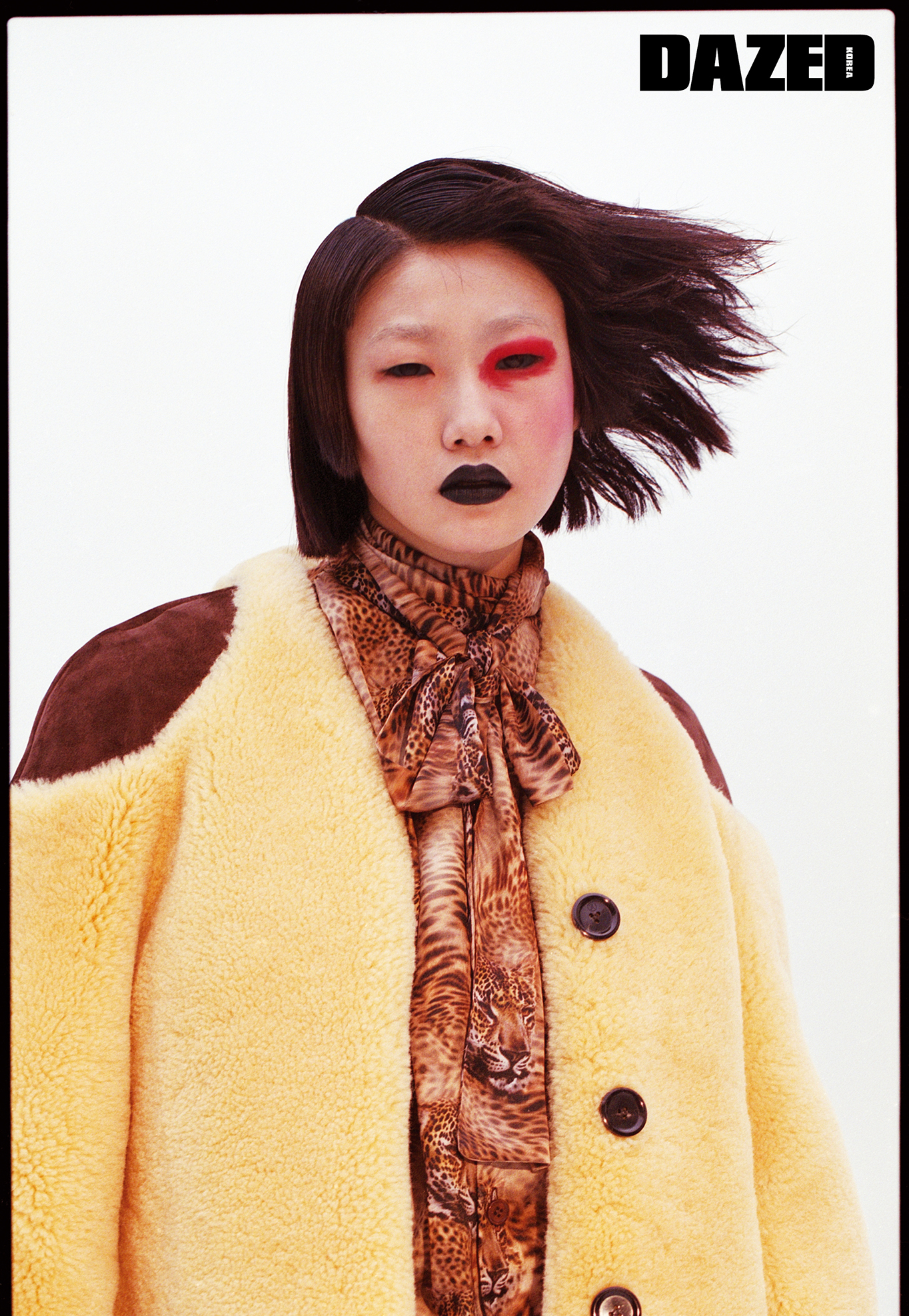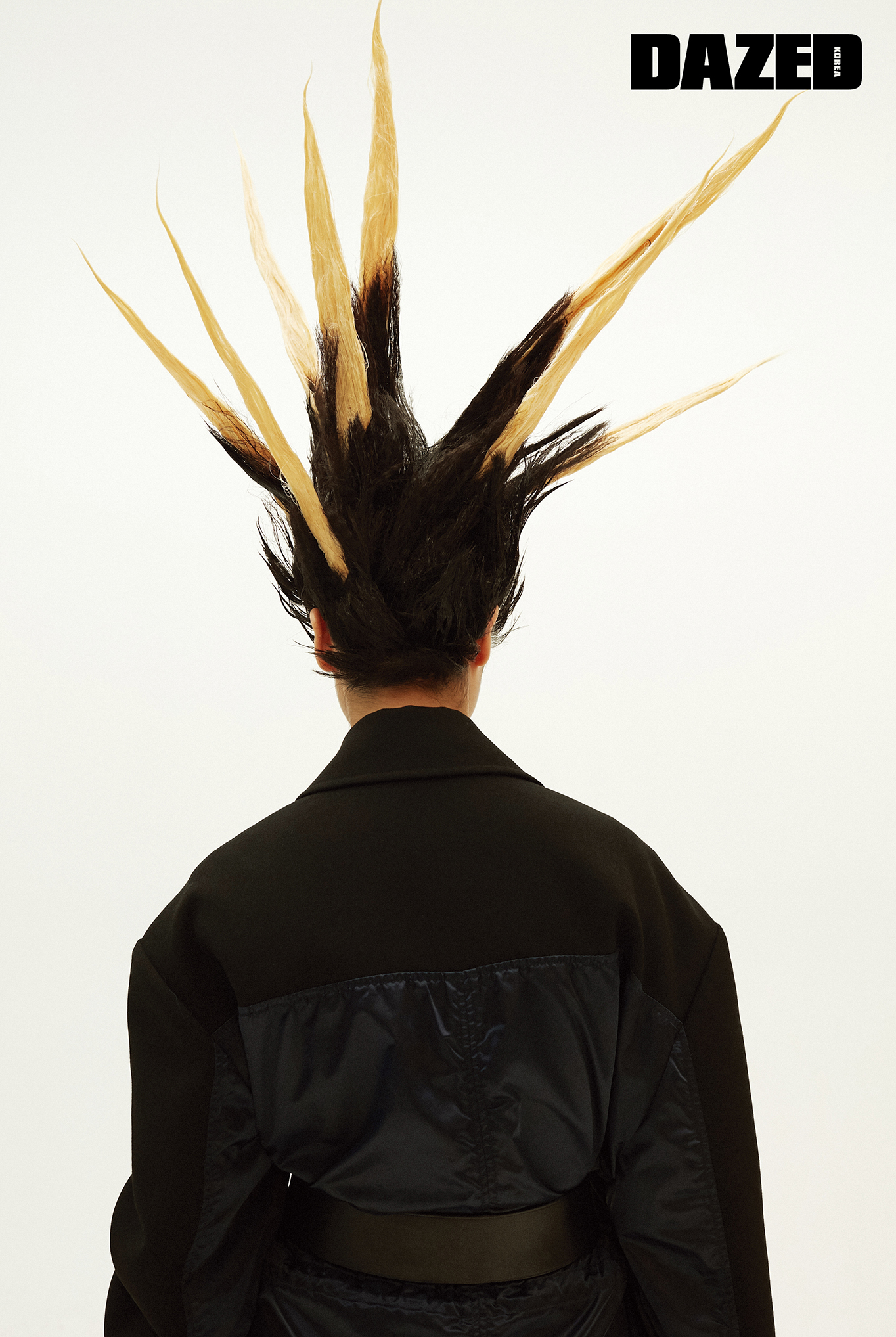 오버사이즈 실루엣 퍼 재킷은 루이 비통(Louis Vuitton), 위아래로 입을 수 있는 리본 셔츠는 팔로모 스페인 by 한스타일(Palomo Spain by Han Style).
