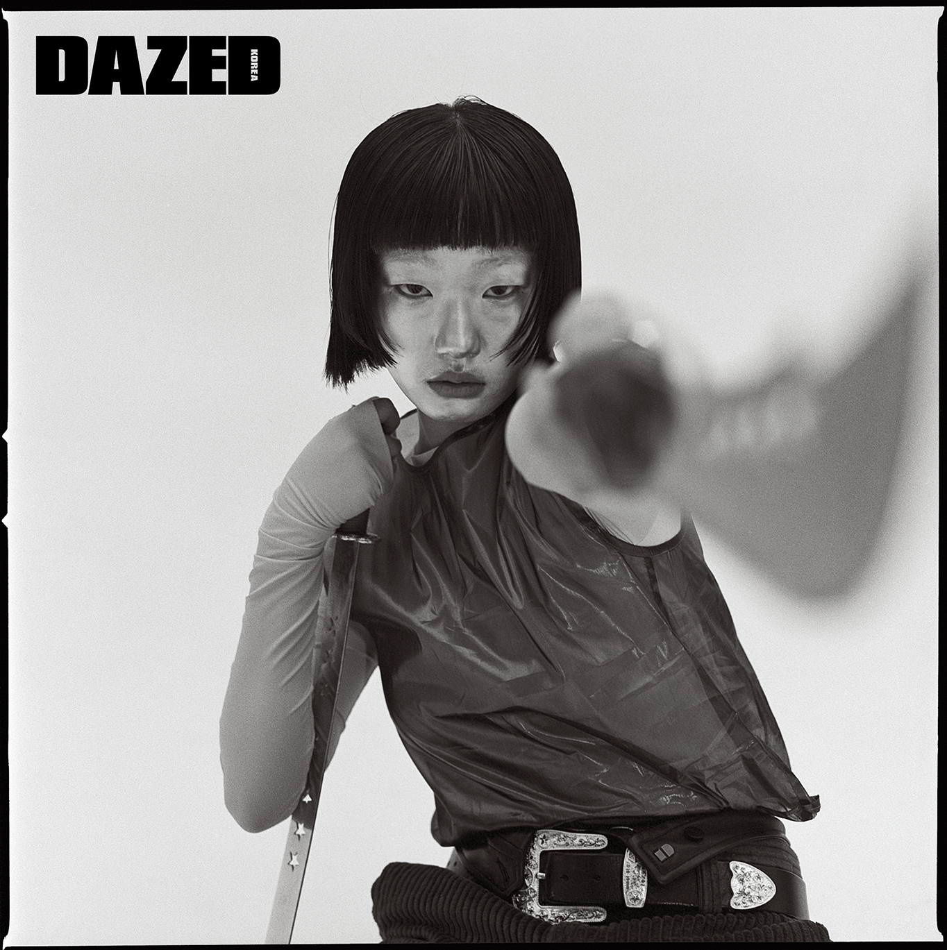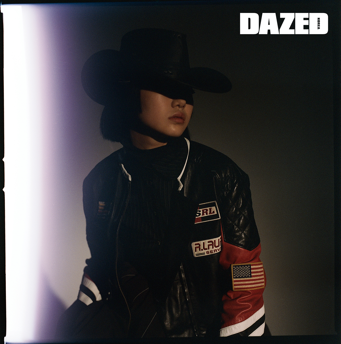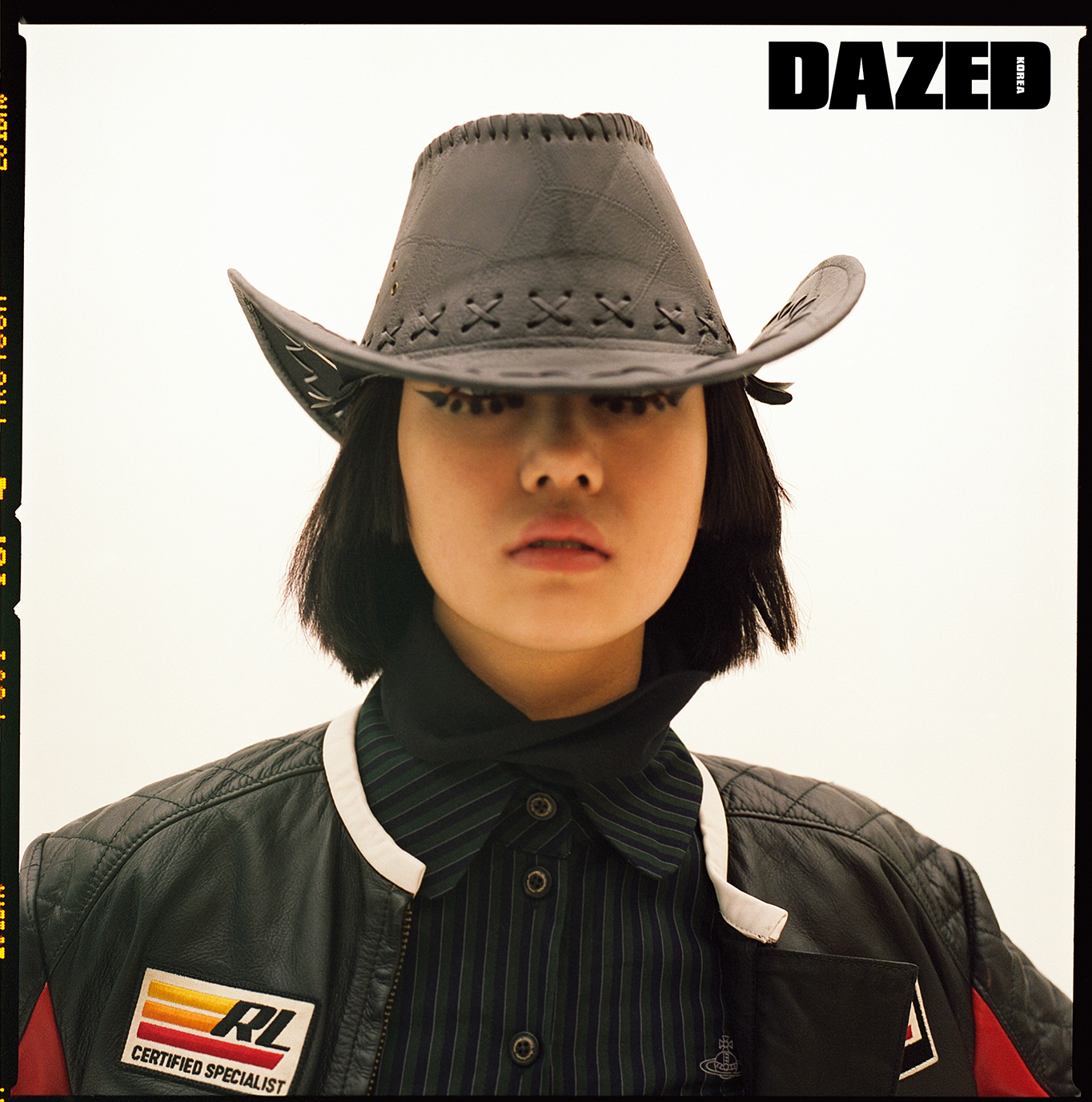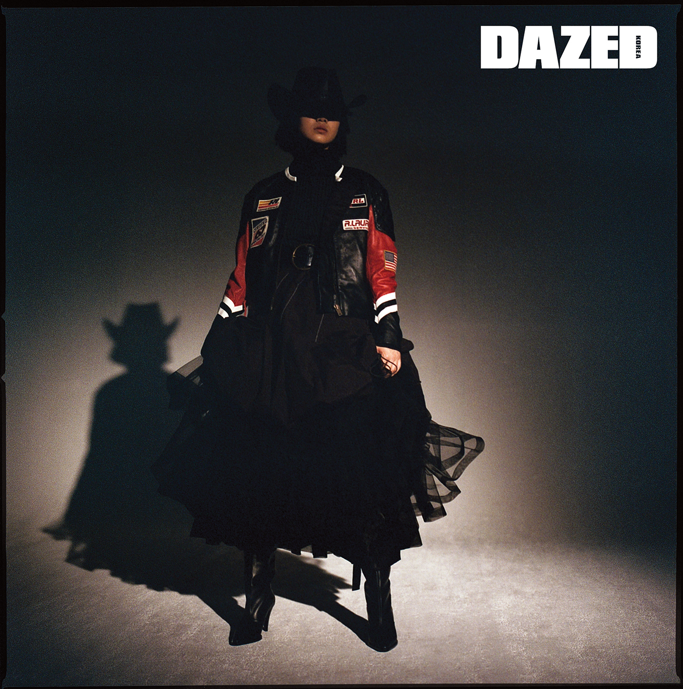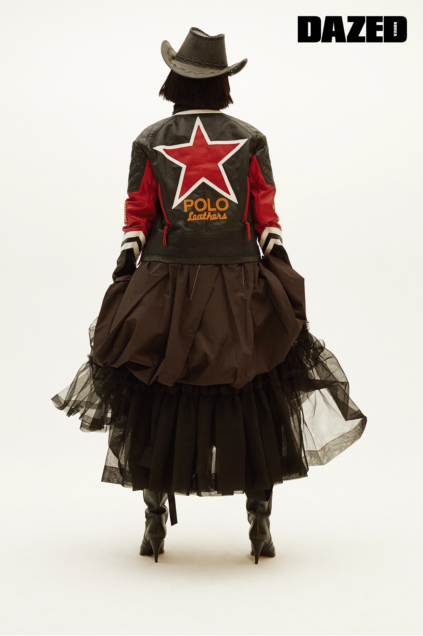 바이커 재킷과 레더 벨트는 폴로 랄프 로렌(Polo Ralph Lauren), 셔츠 원피스는 비비안 웨스트우드(Vivienne Westwood), 튈 스커트는 민주킴(Minjukim), 스트링 장식으로 밑단 조임이 가능한 스커트는 마르니(Marni), 웨스턴 부츠는 니나 리치(Nina Ricci), 모자는 에디터의 것.
