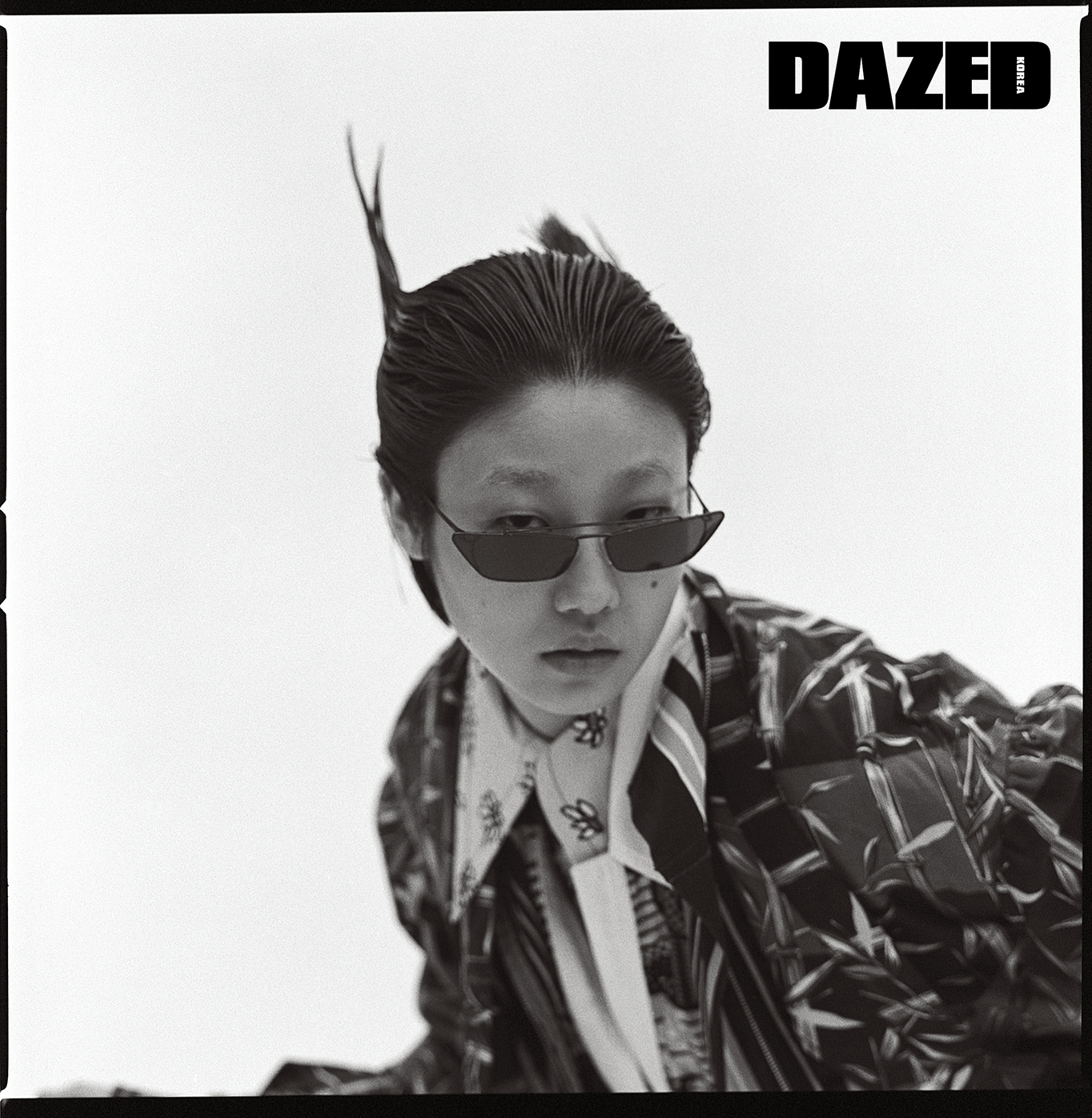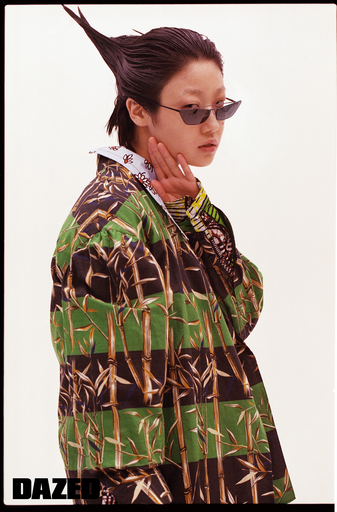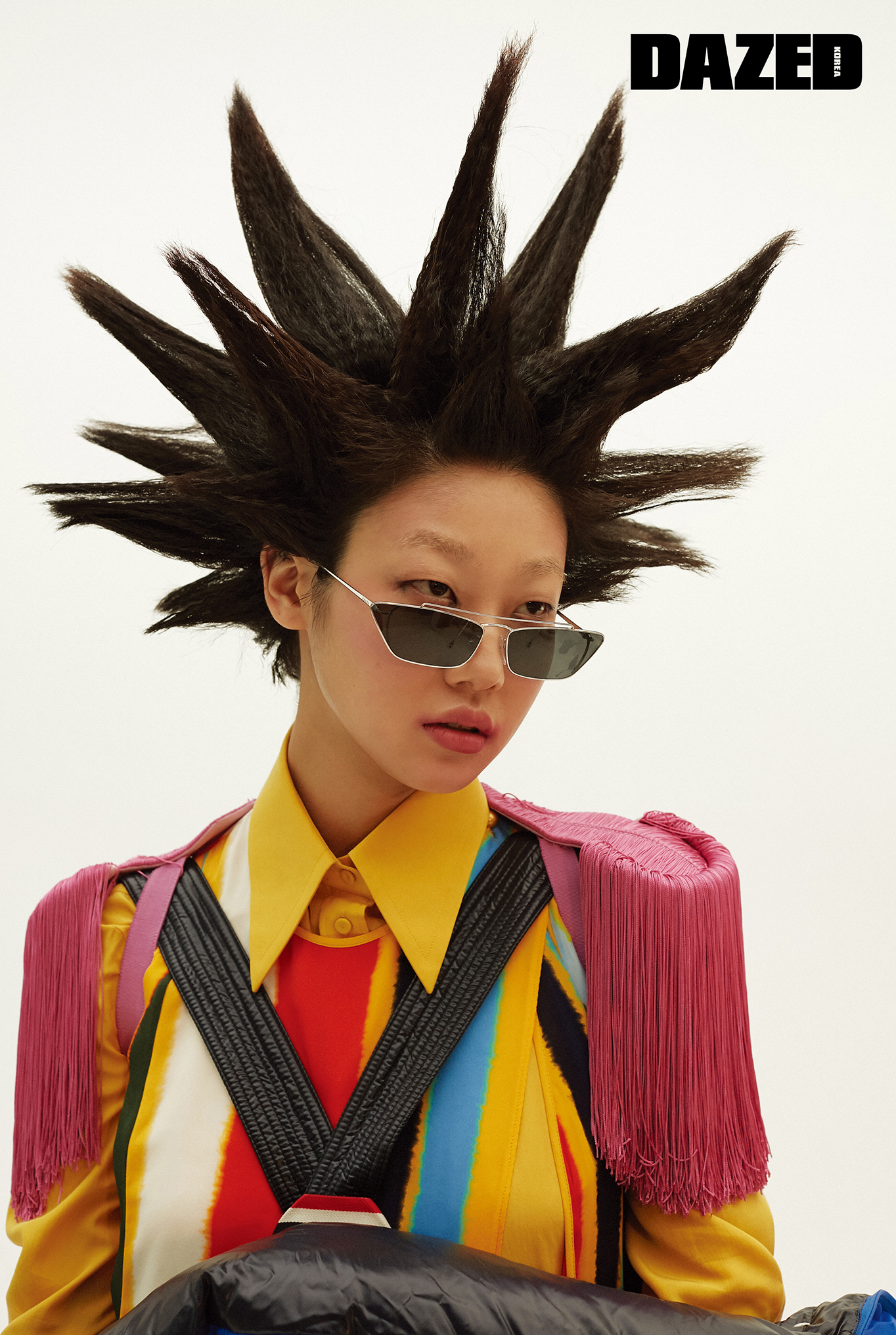 기모노 모티브 셔츠와 이너로 입은 플라워 패턴 티셔츠는 겐조(Kenzo), 스트라이프 저지 원피스는 JW 앤더슨 by 한스타일(JW Anderson by Han Syle), 럭비 셔츠 칼라를 장식한 패턴 드레스와 스니커즈는 스텔라 매카트니(Stella McCartney), 셔츠는 마르니(Marni), 팬츠는 조셉(Joseph), 선글라스는 프라다 by 룩소티카(Prada by Luxottica).