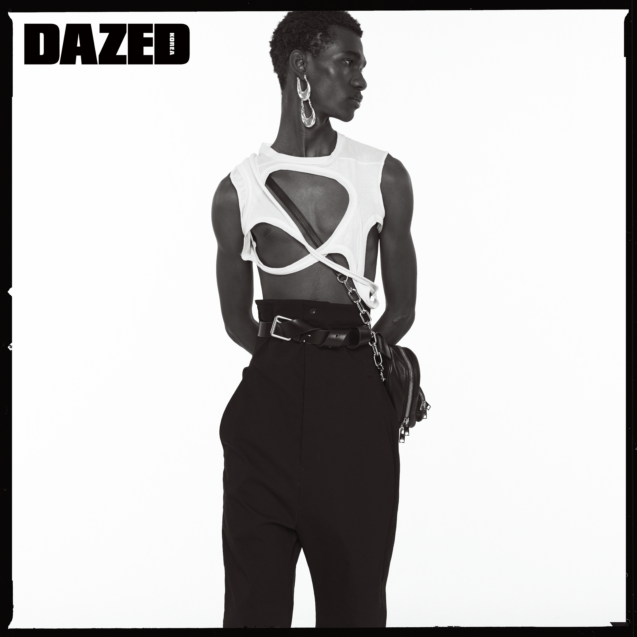 컷아웃 디테일 탱크톱과 하이웨이스트 팬츠는 릭 오웬스(Rick Owens), 크로스백은 알렉산더 왕(Alexander Wang), 가죽 벨트는 와일드 브릭스(Wild Bricks), 이어링은 브릴 피스(Brill Piece).