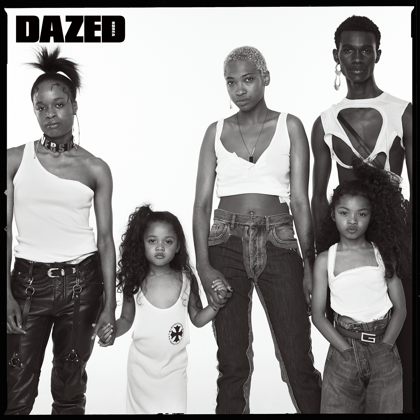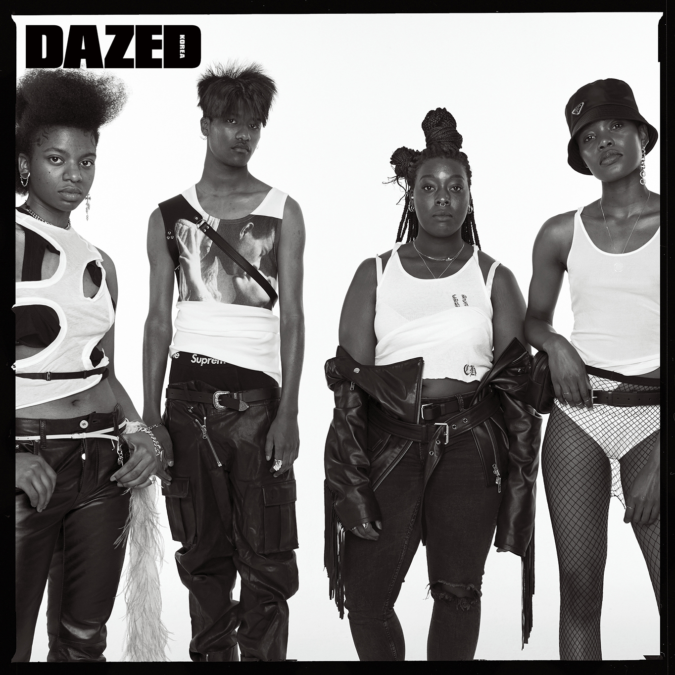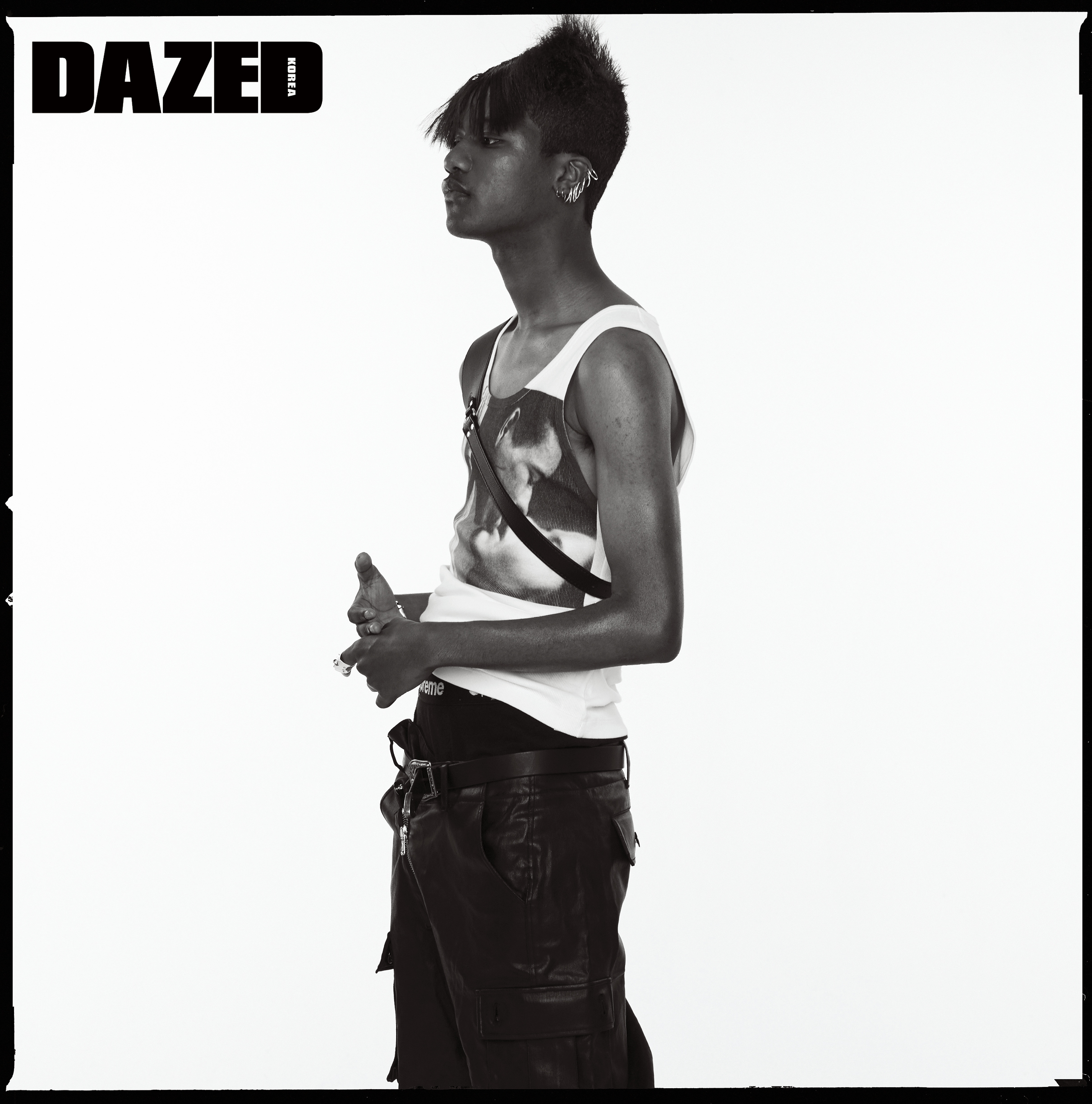 ‘앤디 워홀 키스 캡슐 컬렉션’ 탱크톱은 캘빈 클라인 언더웨어(Calvin Klein Underwear), 레더 팬츠는 바로크(Baroque), 벨트는 와일드 브릭스(Wild Bricks), 아머 링은 비비안 웨스트우드(Vivienne Westwood), 피어싱과 하네스는 스타일리스트의 것.