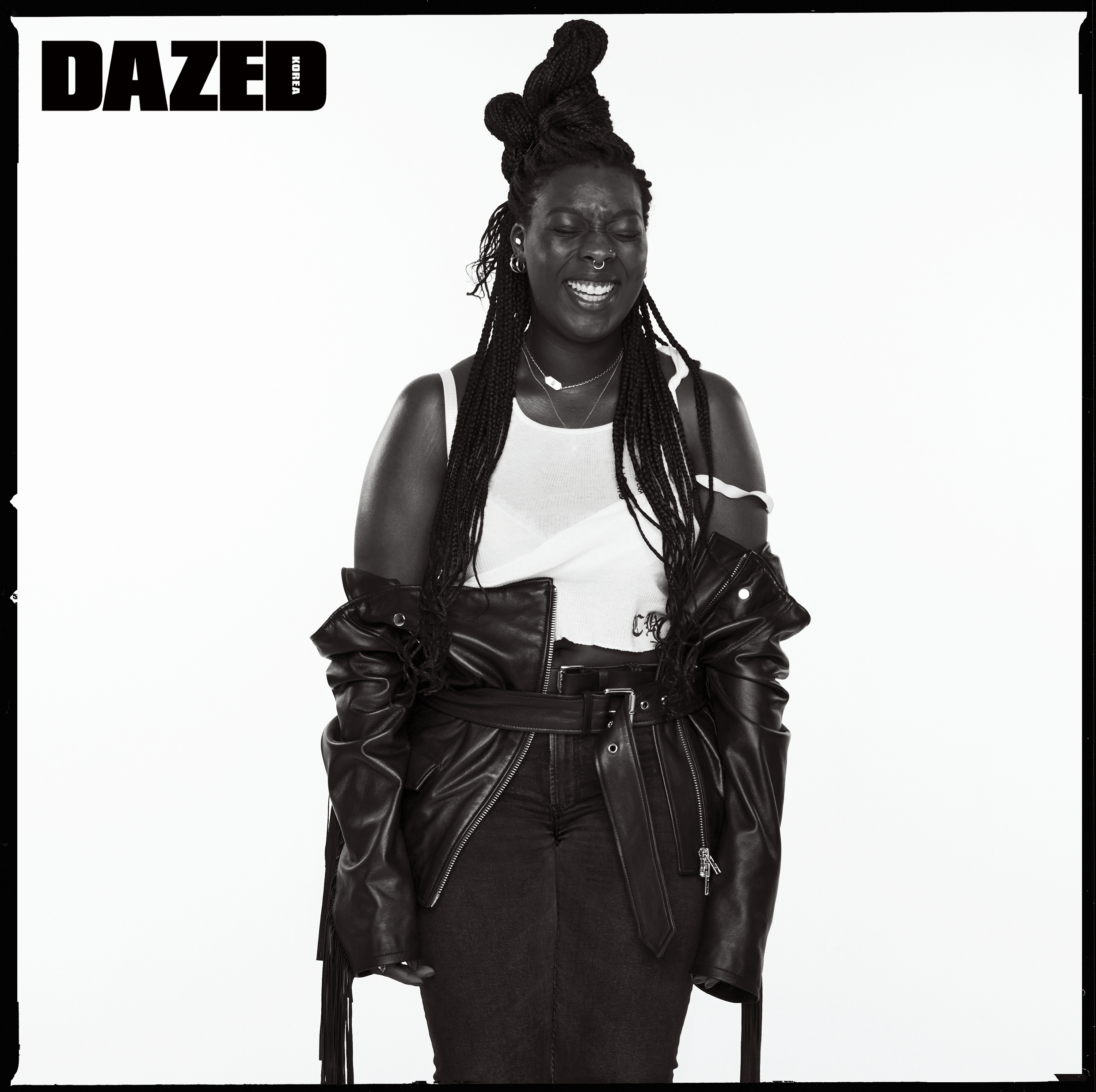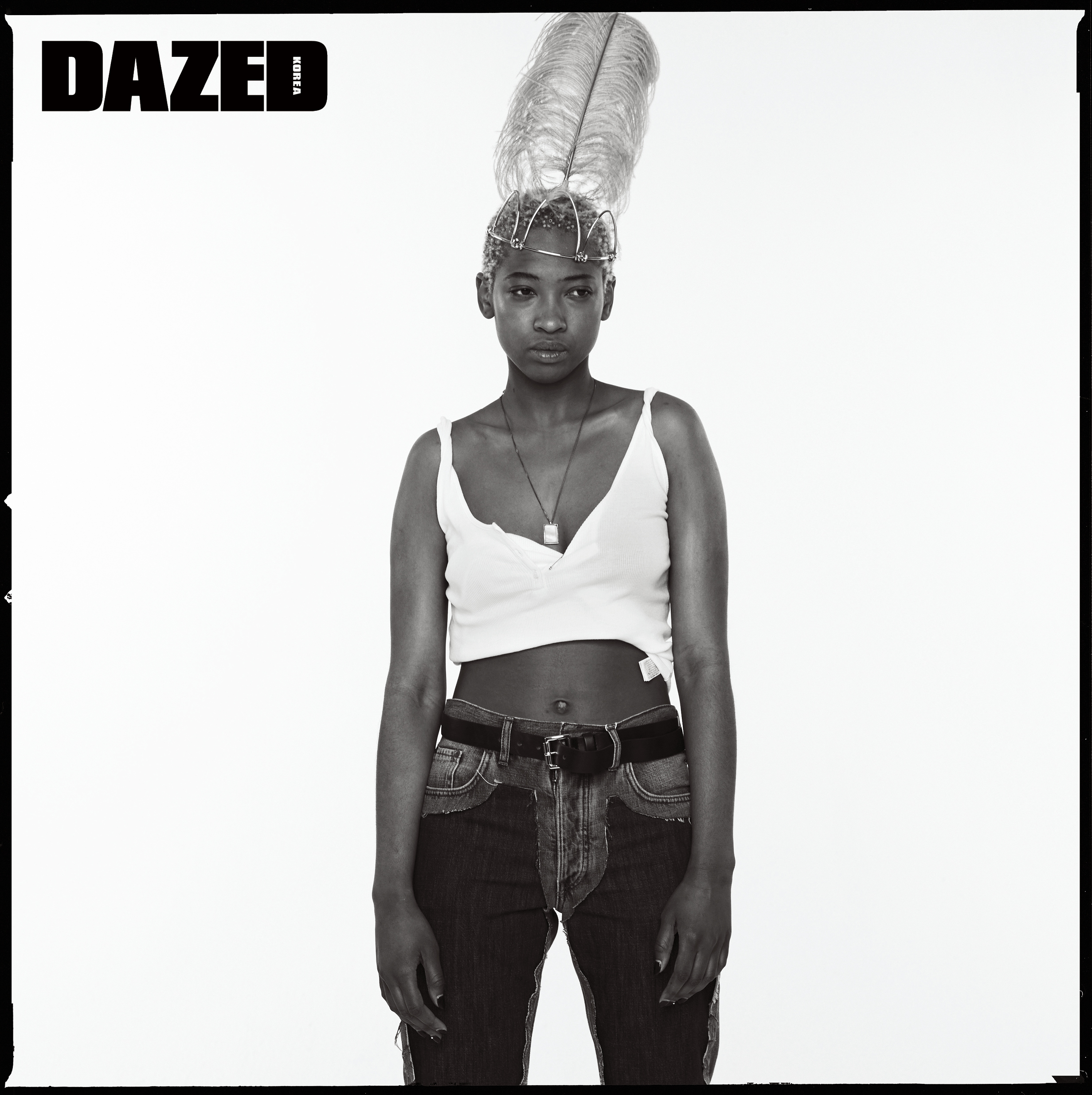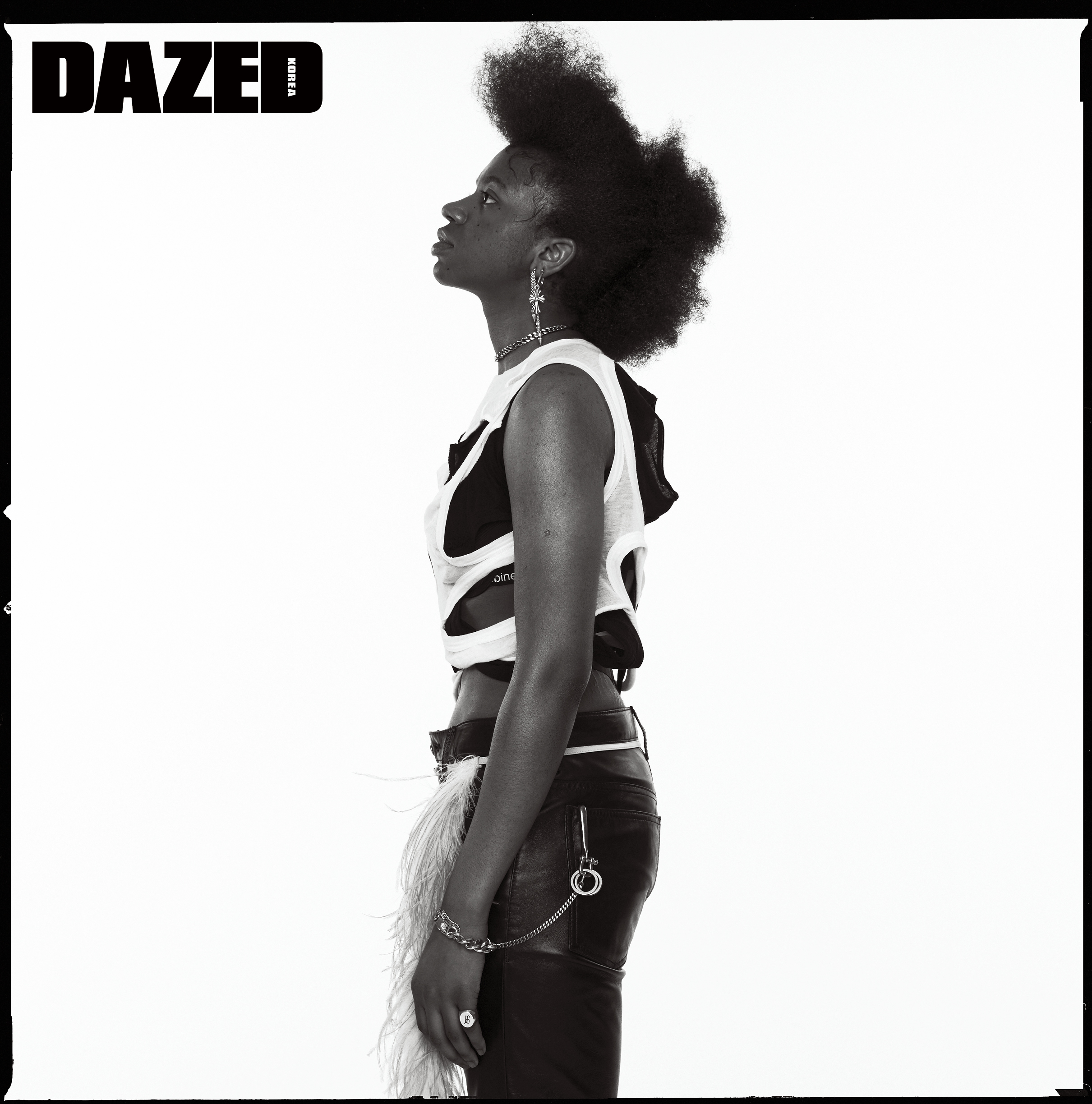 컷아웃 탱크톱은 릭 오웬스(Rick Owens), 레더 팬츠는 코치(Coach), 벨트로 연출한 깃털 장식 네크리스는 니나 리치(Nina Ricci), 체인 키링은 와일드 브릭스(Wild Bricks), 브레이슬릿과 이니셜 링은 에이치알(H.R.), 이어링은 크롬 하츠(Chrome Hearts), 체인 초커는 젬 앤 페블스(Jem & Pebbles).