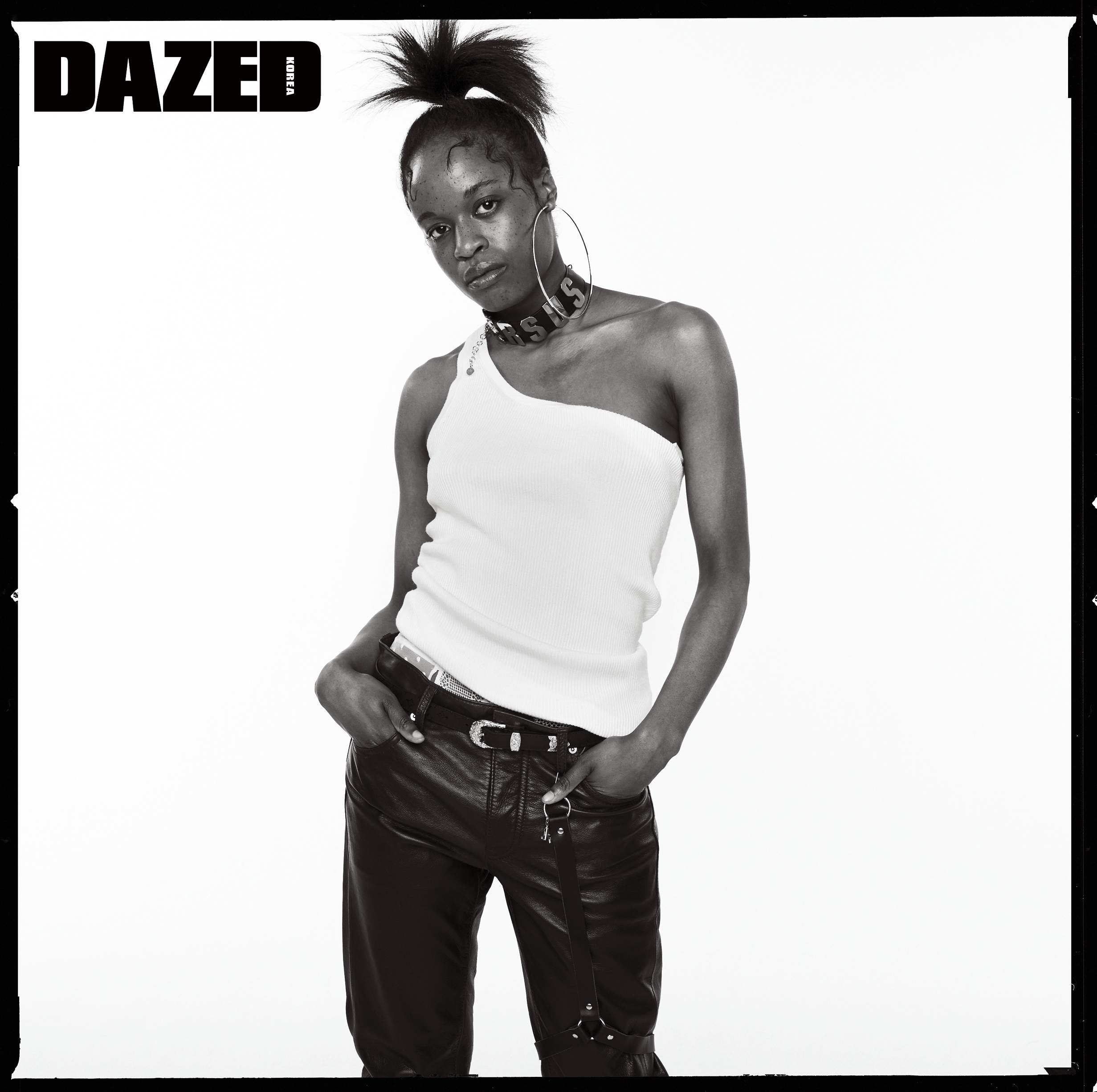 니트 탱크톱은 마이클 코어스(Michael Kors), 레더 팬츠는 코치(Coach), 웨스턴 벨트는 루이 비통(Louis Vuitton), 레이스 브리프는 에탐(Etam), 로고 초커는 베르수스(Versus), 후프 이어링과 서스펜더는 스타일리스트의 것.