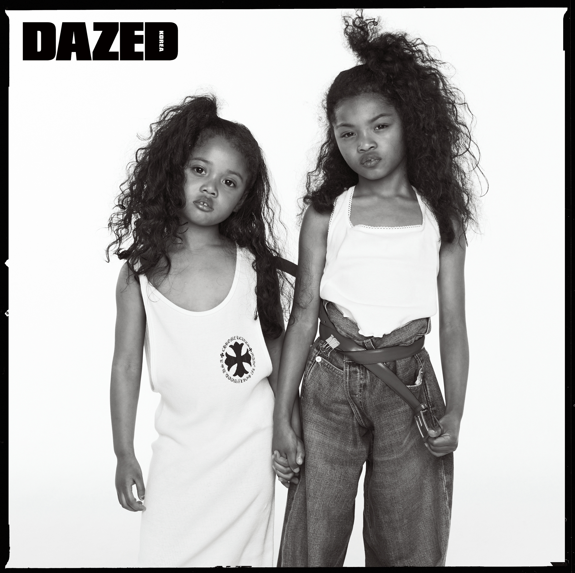 왼쪽 모델이 입은 로고 탱크톱은 크롬 하츠(Chrome Hearts). 오른쪽 모델이 입은 탱크톱은 포에버21(Forver21), 데님 팬츠는 간니 by 네타포르테(Ganni by Net-a-Porter), 로고 버클 벨트는 구찌(Gucci).