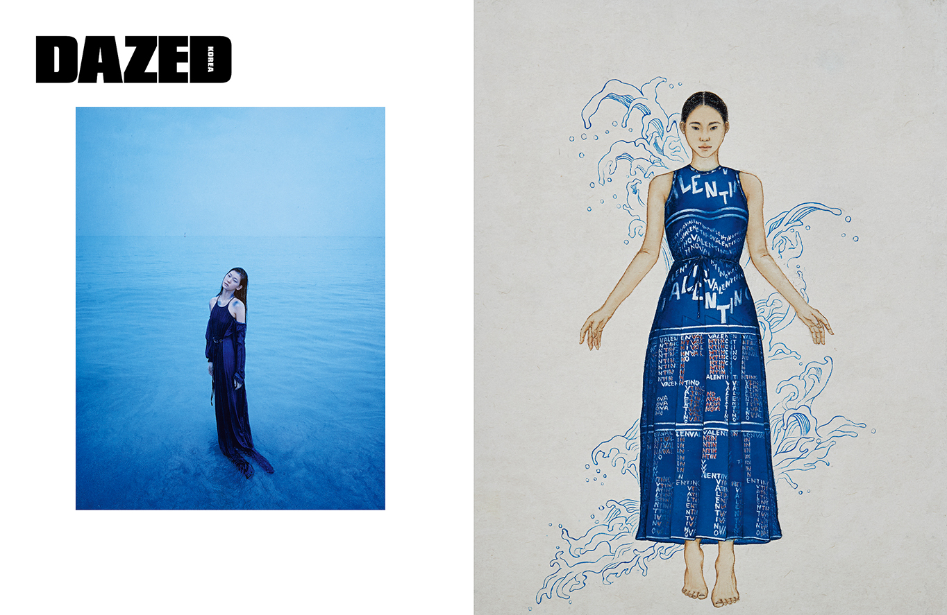 코발트 블루 컬러의 콜드 숄더 롱 드레스는 루이 비통(Louis Vuitton).