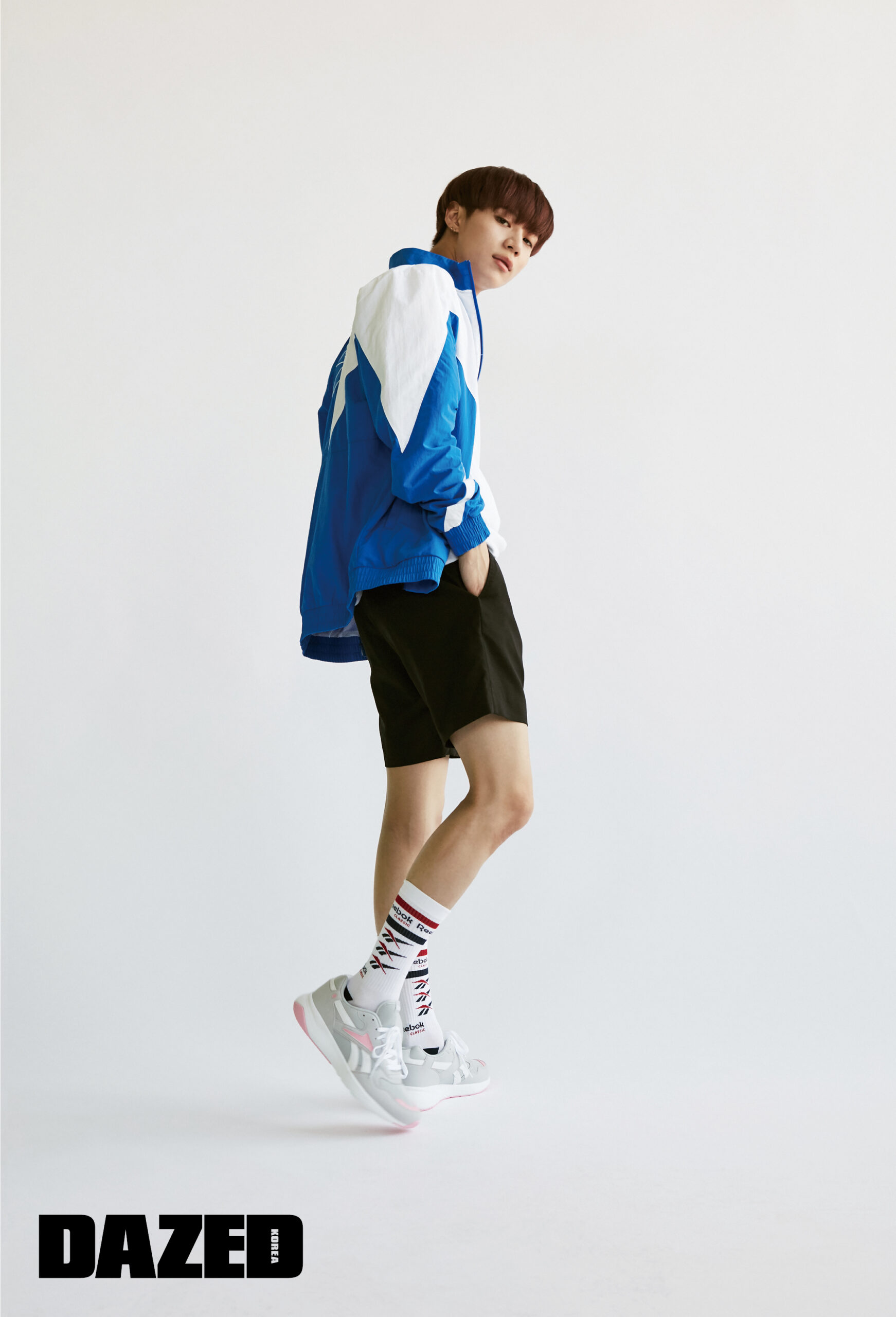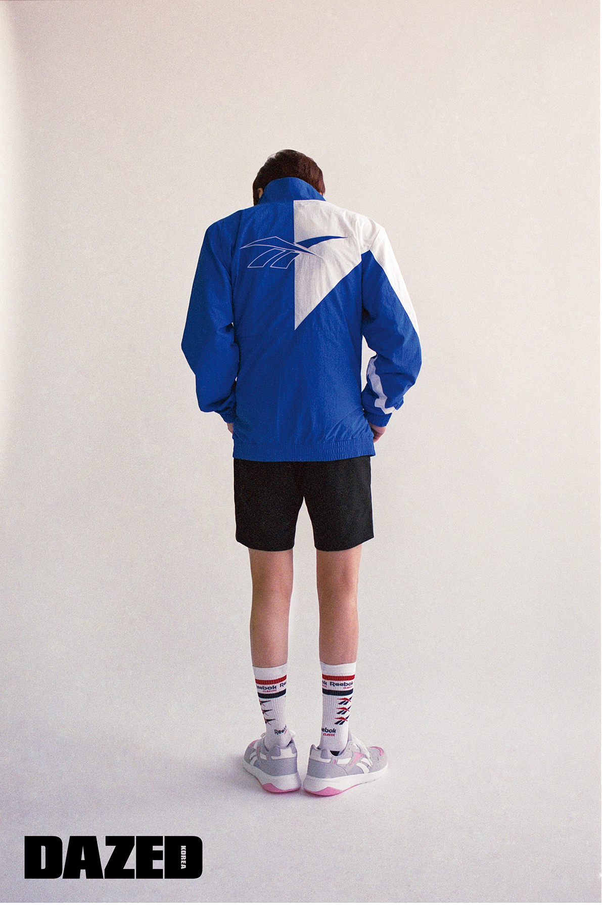 리복 클래식 로고로 등판을 장식한 청량한 파란색 나일론 점퍼인 벡터 트랙 톱, 양말, 핑크 컬러로 포인트를 준 데쉬오닉은 모두 리복 클래식(Reebok Classic), 쇼츠는 에디터의 것.