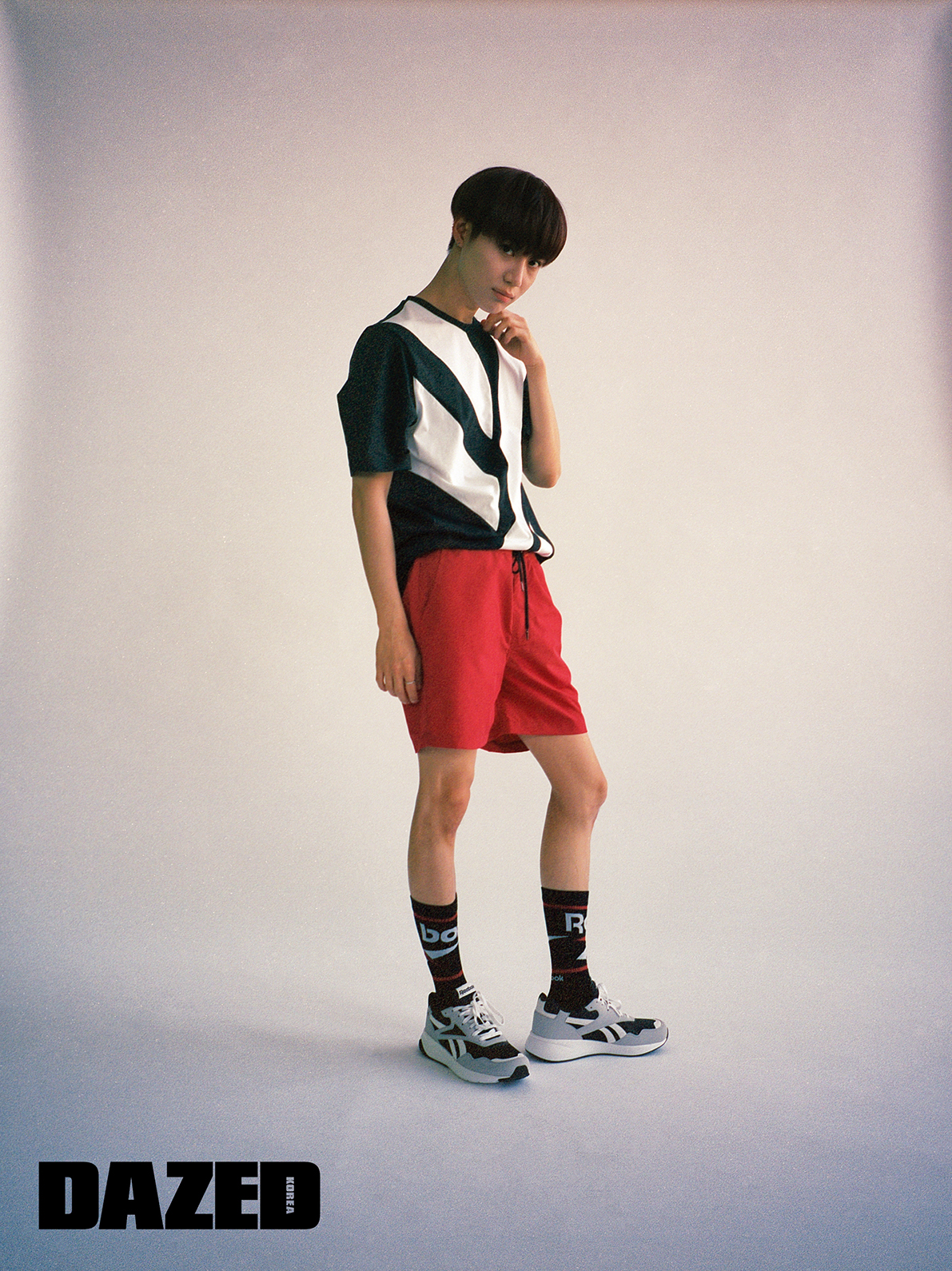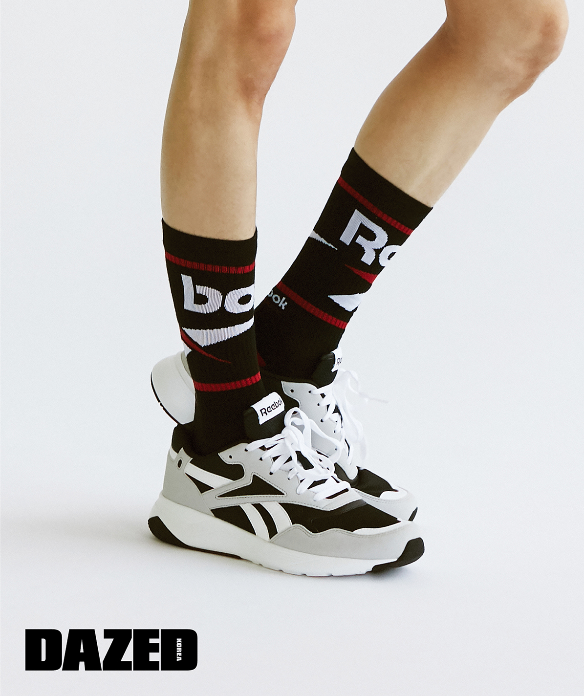 리복을 다양한 언어로 프린트한 스웨트셔츠와 양말, 레트로한 러닝 실루엣의 데쉬오닉은 모두 리복 클래식(Reebok Classic), 컬러 블록 쇼츠는 겐조(Kenzo).
