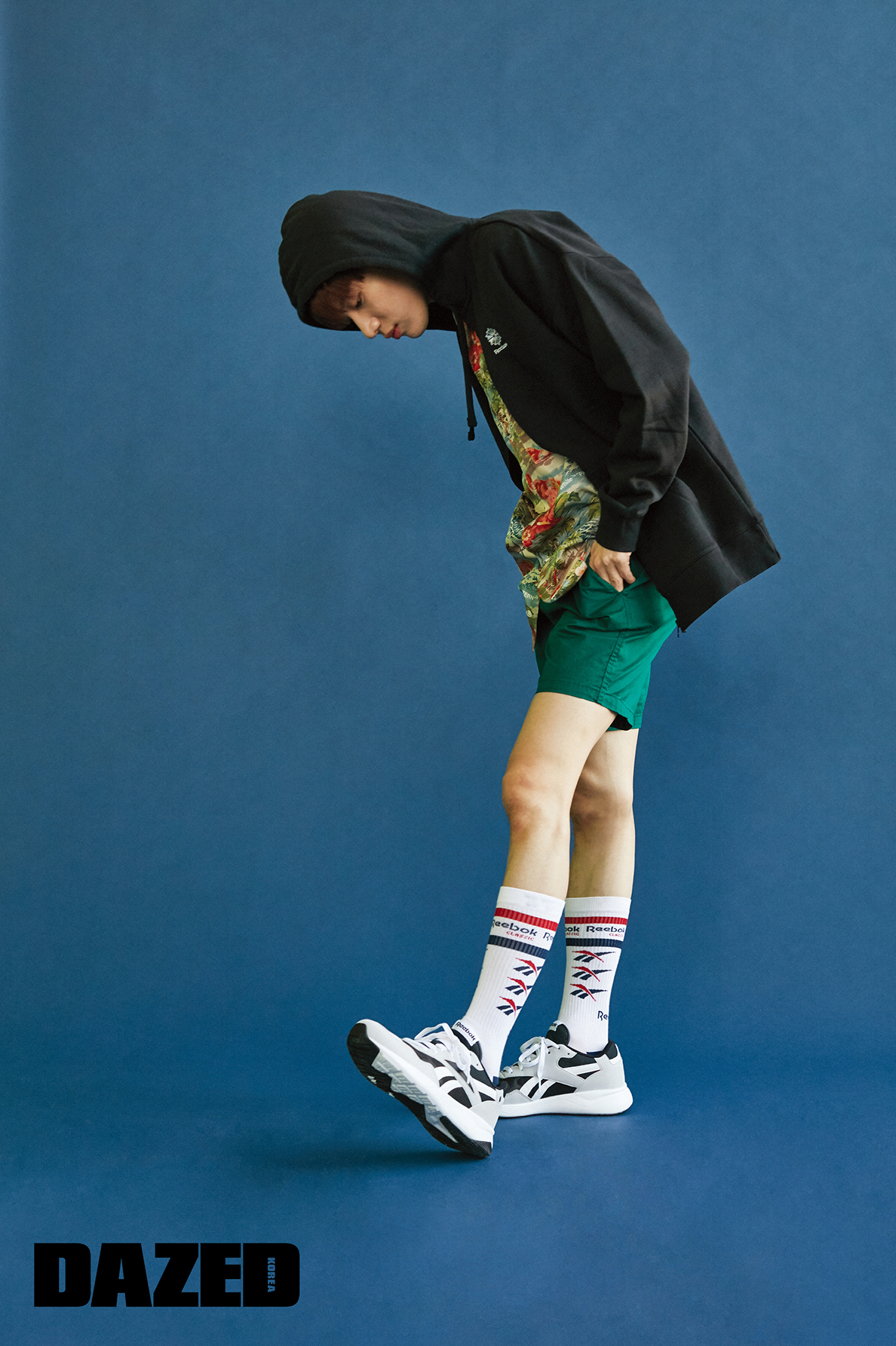 왼쪽 가슴에 리복 로고를 자수 처리한 검정 집업 점퍼, 양말, 데일리 스니커즈로 신기 좋은 데쉬오닉은 모두 리복 클래식(Reebok Classic), 하와이안 셔츠는 오프화이트(Off-White), 쇼츠는 커버낫(Covernat).