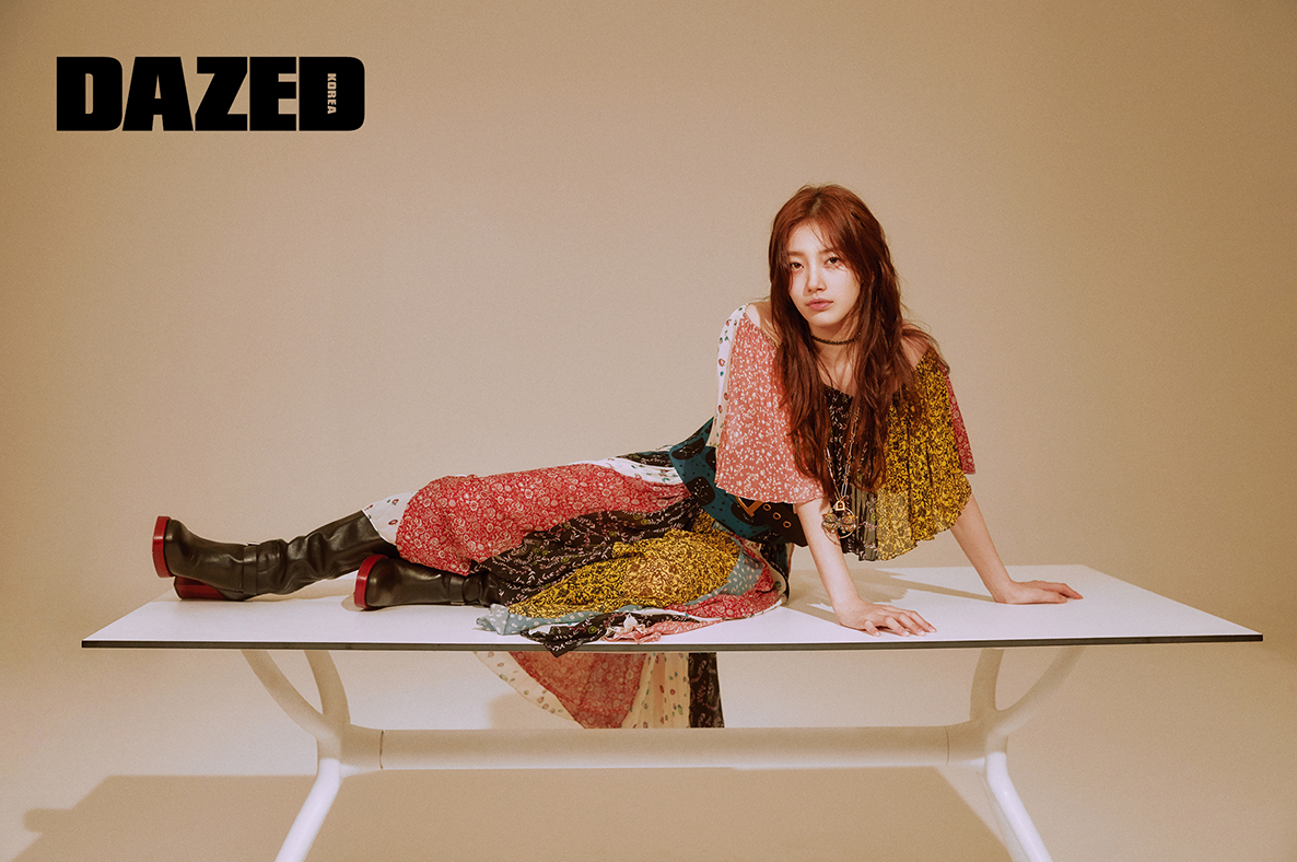 패치워크 프린트가 돋보이는 실크 오프숄더 드레스, 샤이니 카프스킨 사이드 라인 하이 부츠, DIORQUAKE 카프스킨 벨트, 메탈 자디올 초커와 버터플라이 스테이트먼트 롱 네크리스는 모두 디올(Dior).