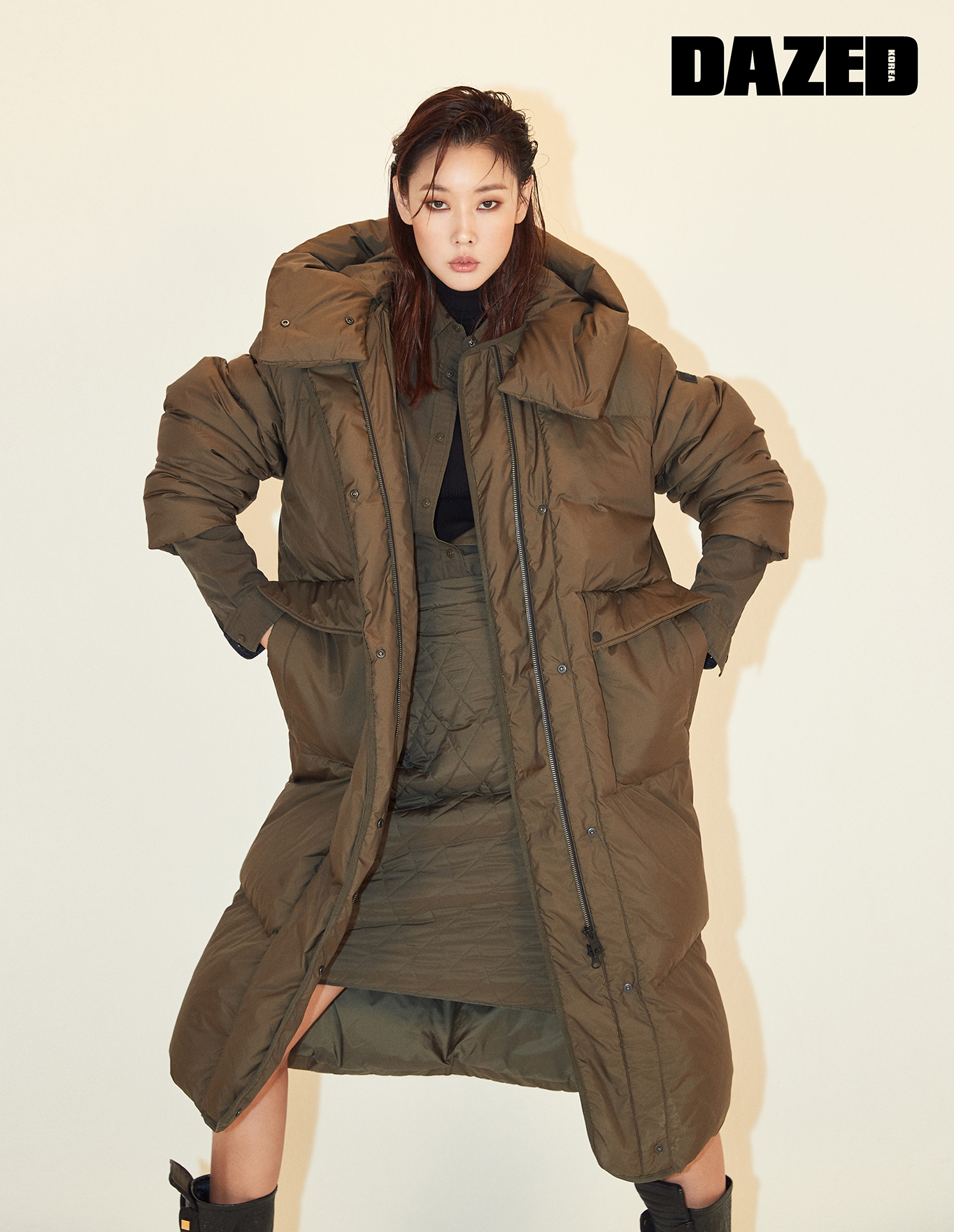 메르시(Merci) 롱다운과 스텔라(Stella) 셔츠 원피스, 스텔라 퀄팅 스커트는 모두 라푸마(Lafuma), 레이스업 부츠는 스튜어트 와이츠먼(Stuart Weitzman).