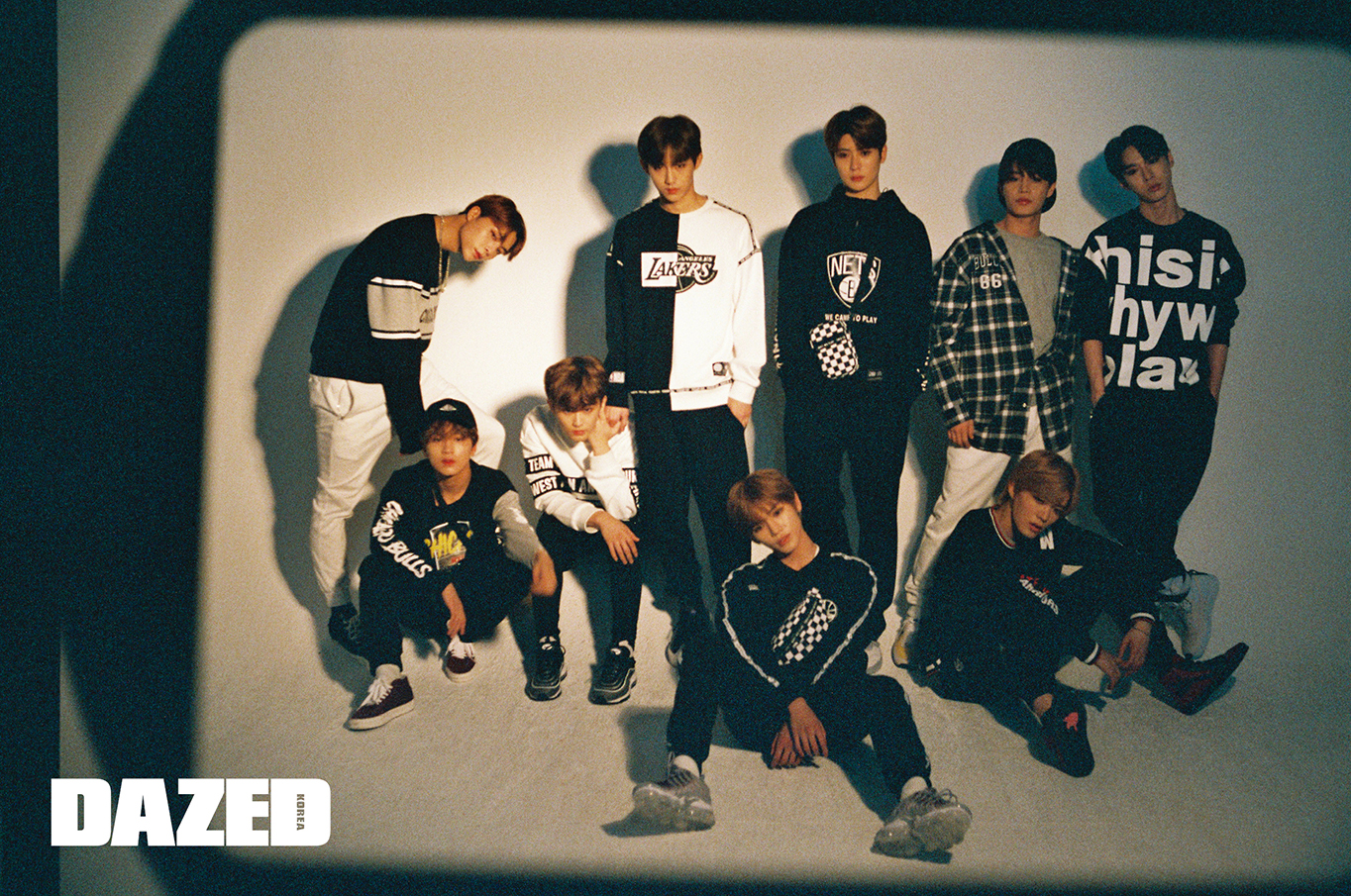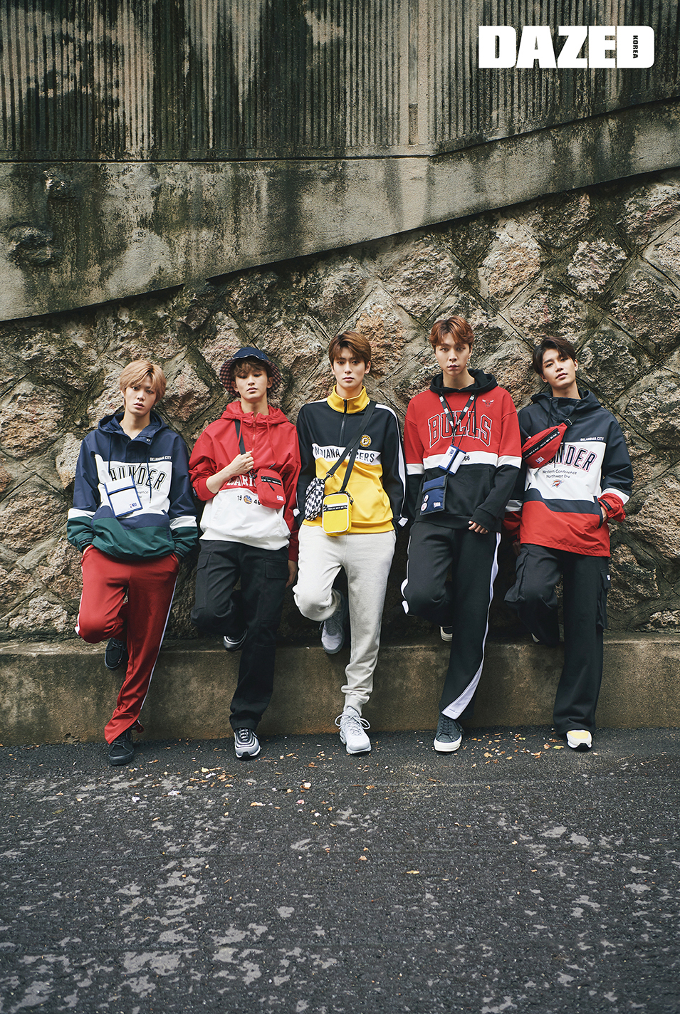 NCT 127이 착용한 빅 로고 맨투맨 티셔츠와 가방, HYFALT 캡, 농구공은 모두 엔비에이(NBA).