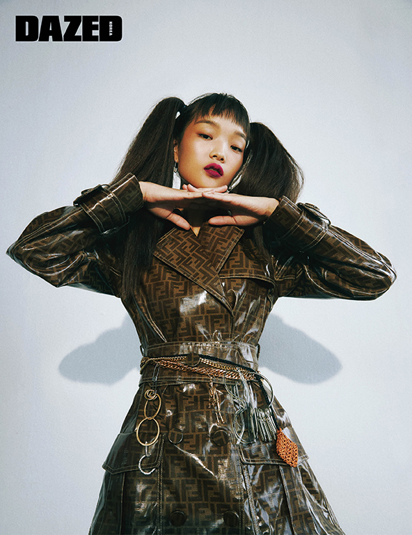 로고를 반복적으로 프린트한 PVC 트렌치코트는 펜디(Fendi), 오른쪽 귀에 착용한 옷핀 모양 귀고리와 허리에 참 장식처럼 사용한 귀고리는 모두 뚜아후아(Trois Rois), 투명 프레임 안경은 젠틀몬스터(Gentle Monster), 니트로 만든 네크리스는 미쏘니(Missoni).