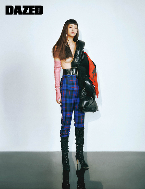 타탄체크 팬츠는 베르사체(Versace), 왼쪽 어깨를 감싼, 다운 점퍼로 만든 플레어스커트는 6 몽클레어 느와 케이 니노미야(6 Moncler Noir Kei Ninomiya), 울 스카프는 막스마라(Maxmara), 빨간 프린트 스카프는 캘빈 클라인 205W39NYC(Calvin Klein 205W39NYC)로 에디터의 것, 오른손에 낀 레더 글러브는 샤넬(Chanel), 커다란 버클 벨트는 생 로랑 by 안토니 바카렐로(Saint Laurent by Anthony Vaccarello), 스톤 장식 스웨이드 롱부츠는 지미추(Jimmy Choo), 링 귀고리는 에디터의 것.