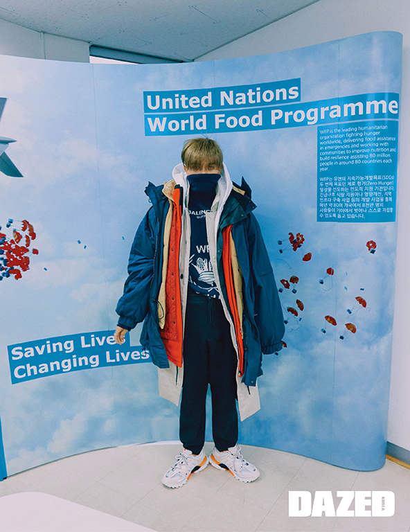 오늘 입은 ‘발렌시아가 2018 겨울 컬렉션’ 중 여러 벌에서 기아 없는 세상을 위해 활동하는 세계 최대 인도주의 기구인 유엔세계식량계획(WFP)의 로고를 확인할 수 있어요. 로고가 새겨진 옷을 구입하면 구매 금액의 10%가 유엔세계식량계획(WFP)에 자동 기부된다고 해요.