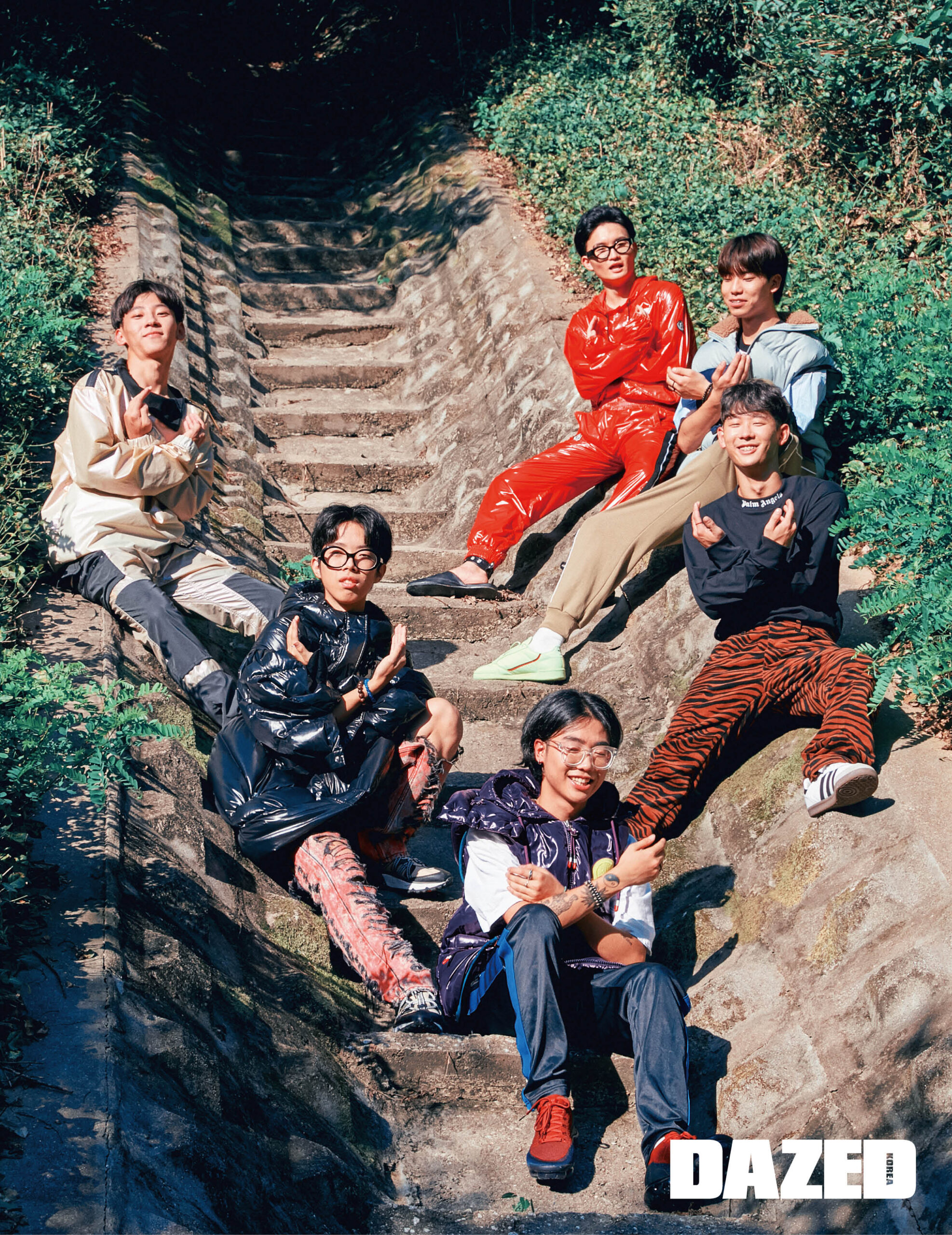 (위부터 시계 방향) 병희가 입은 재킷은 C.P 컴퍼니(C.P Company), 예준이 입은 체크 니트 톱은 펜디(Fendi), 은혁이 입은 레터링 니트 톱은 펜디(Fendi), 동규가 입은 후드 톱은 메종 마르지엘라(Maison Margiela), 효성이 입은 후드 톱은 산드로(Sandro), 인성이 입은 윈드브레이커는 C.P 컴퍼니(C.P Company).