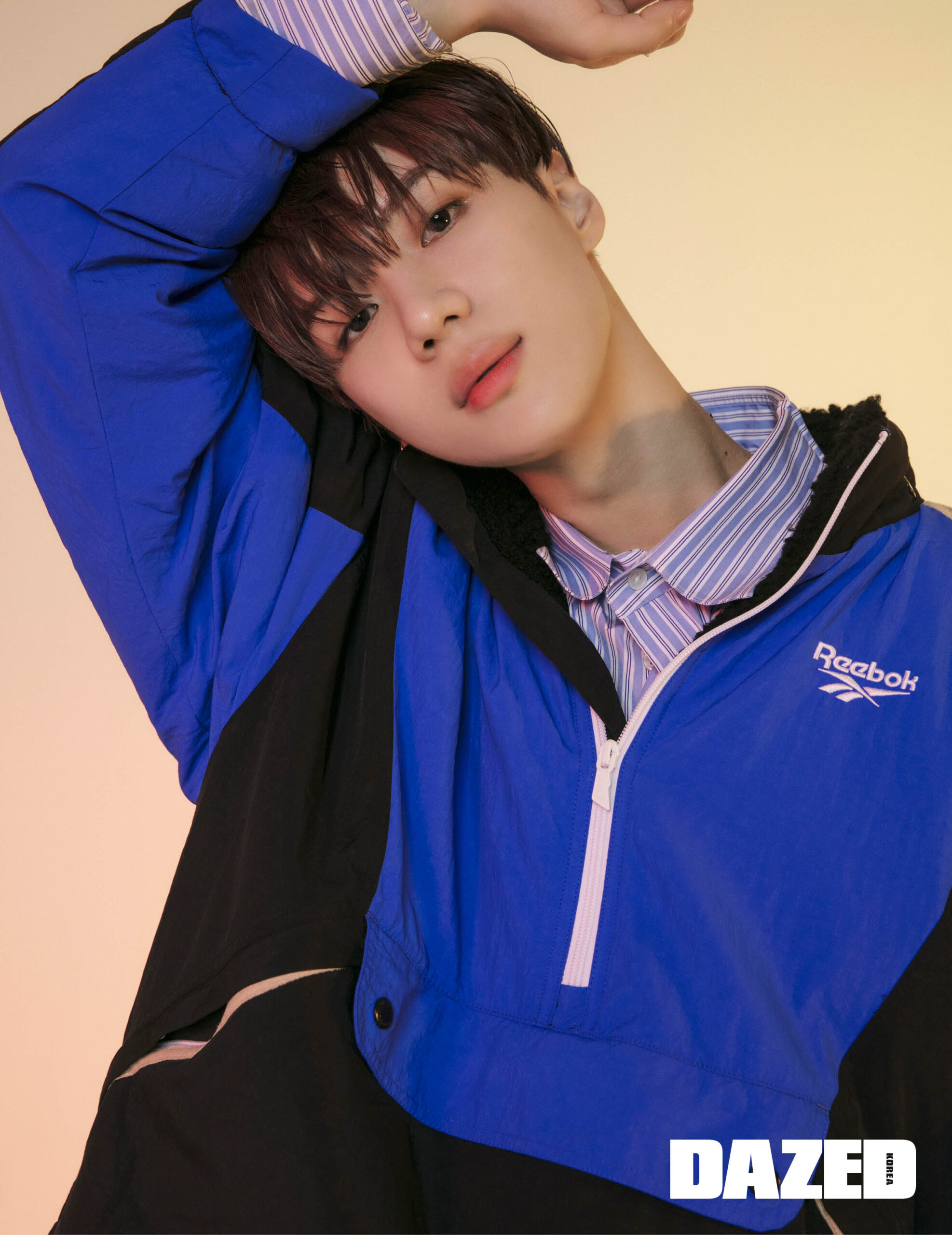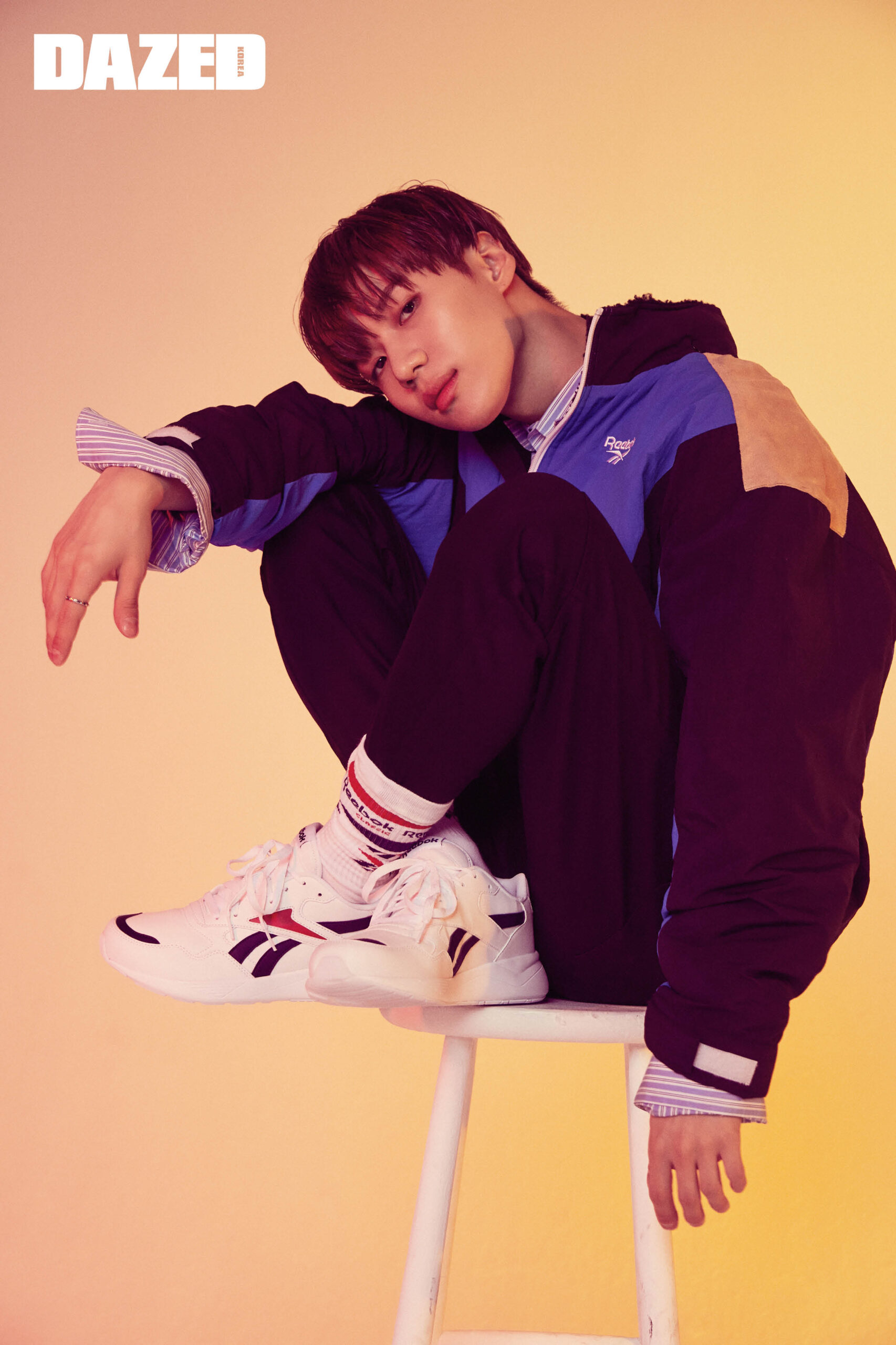 레트로 컬러 배합이 눈에 띄는 아노락 점퍼는 리복 클래식(Rebook Classic), 줄무늬 셔츠는 에디터의 것, 팬츠는 스티그마(Stigma), 로고 양말과 운동화 대쉬오닉은 리복 클래식(Rebook Classic).