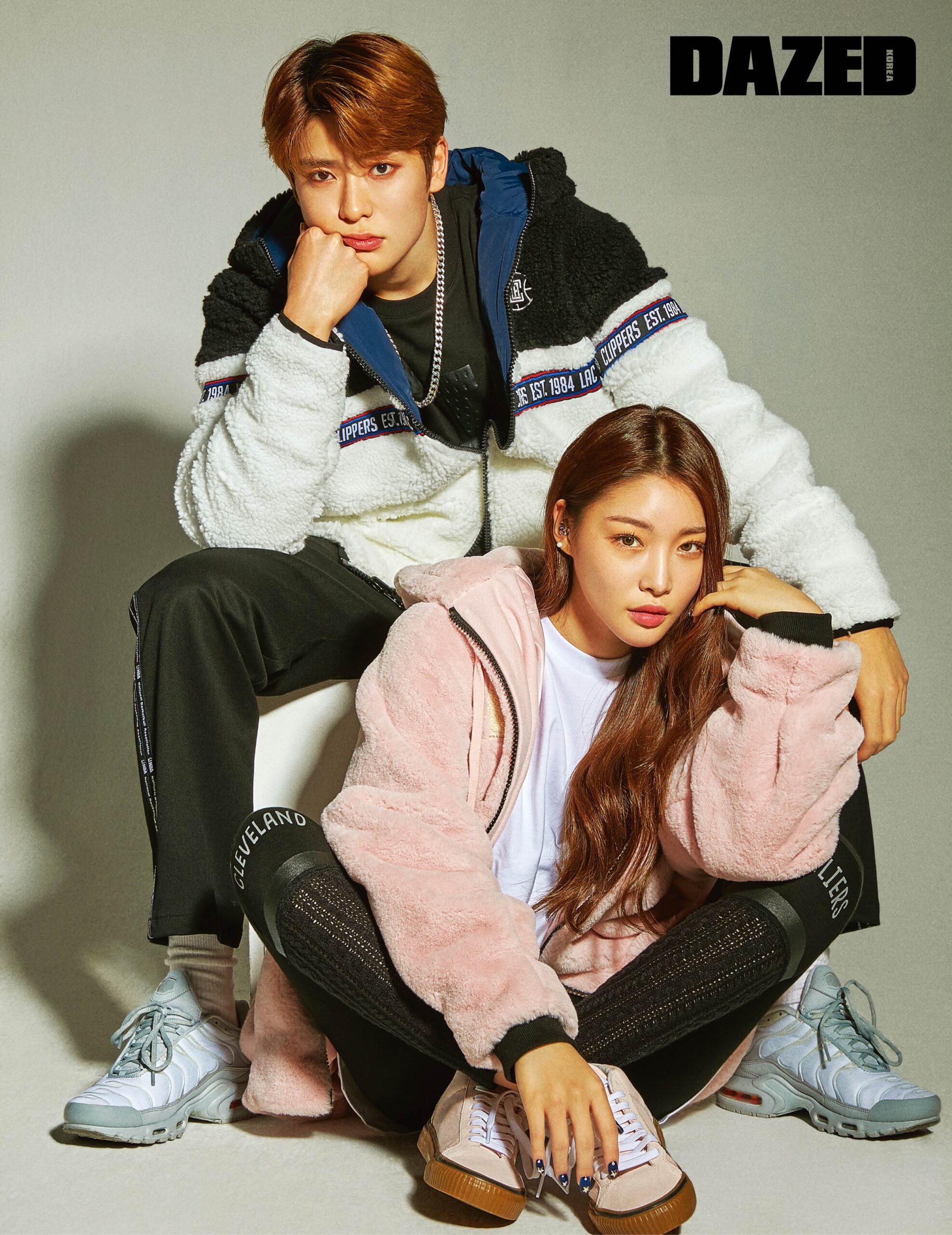 재현 입은 N184TJ133P LAC 보아 리버서블 후드 집업과 N184TS302P LAC 소매 테이프 밍크 보아 맨투맨 티셔츠, N183PT103P NBA 2 LINE 테이프 슬랙스는 모두 엔비에이(NBA), 청하 입은 N184TJ711P BKN 보아 후드 집업과 N184TP793P CLE 니트 배색 레깅스는 엔비에이(NBA).