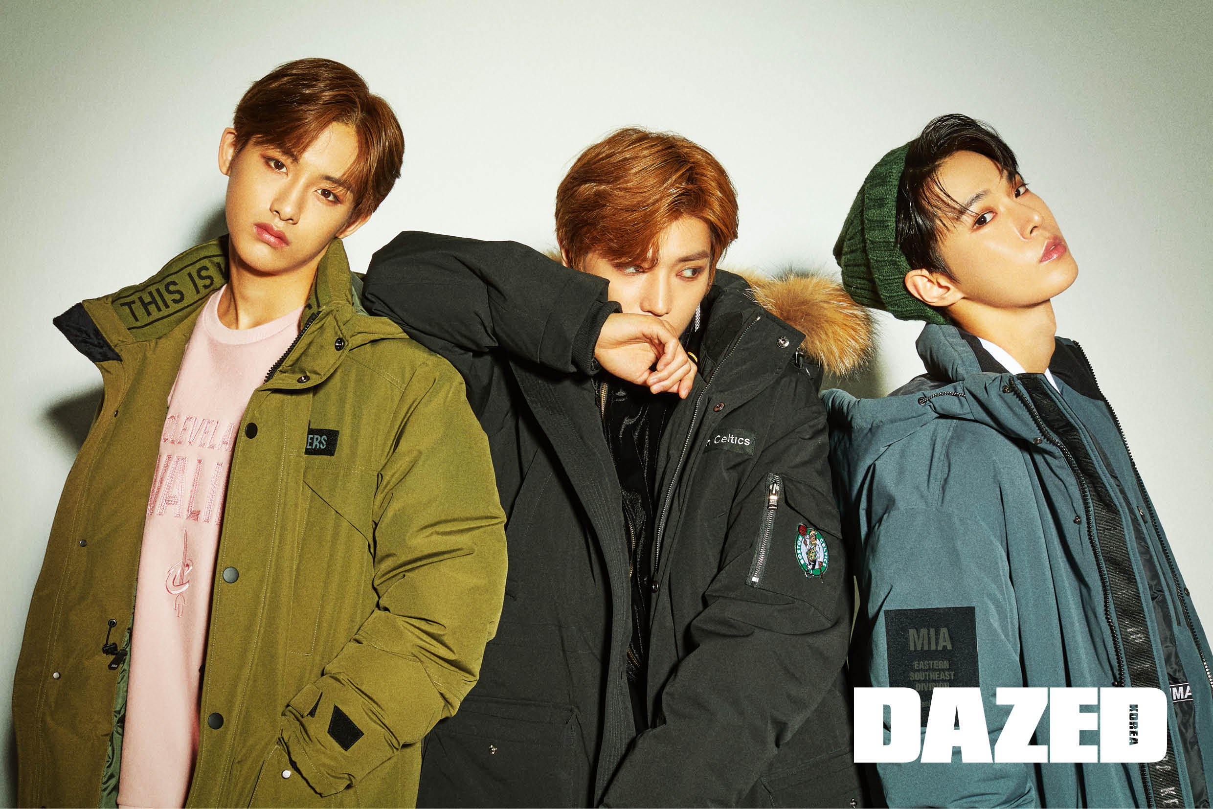 윈윈 입은 N184DW121P CLE 하프 기장 포켓 다운 점퍼, 도영 입은 N184DW122P MIA 다운 점퍼, 태용 입은 N184DW020P BOS 야상 다운 점퍼와 N184TJ351P SAS 파이핑 배색 벨벳 집업, N184TP351P SAS 파이핑 배색 벨벳 팬츠는 모두 엔비에이(NBA).