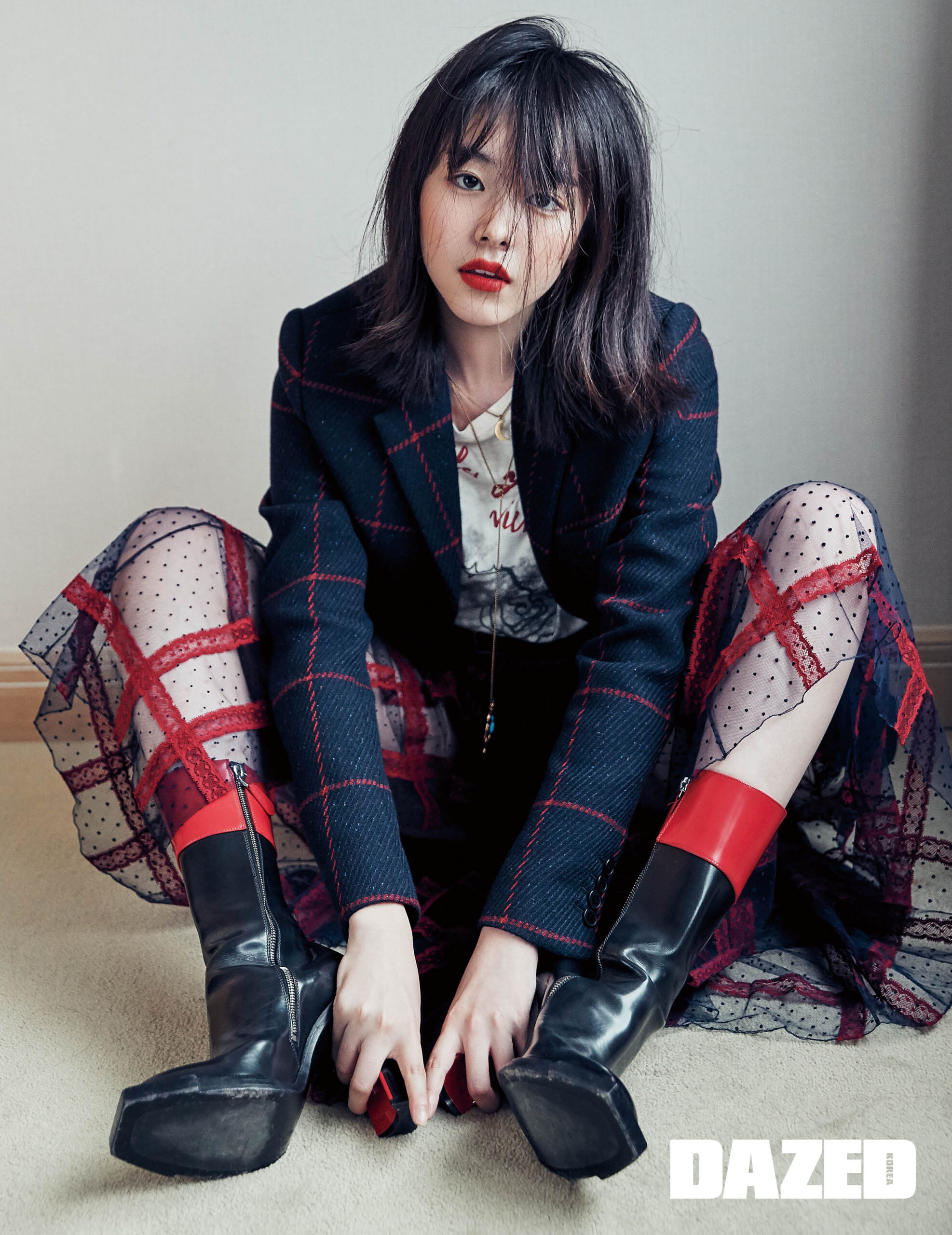 체크 패턴 재킷과 이너로 입은 프린트 톱, 다양한 패턴이 가미된 샤 스커트는 모두 디올(Dior), 부츠는 알렉산더 맥퀸(Alexander McQueen).