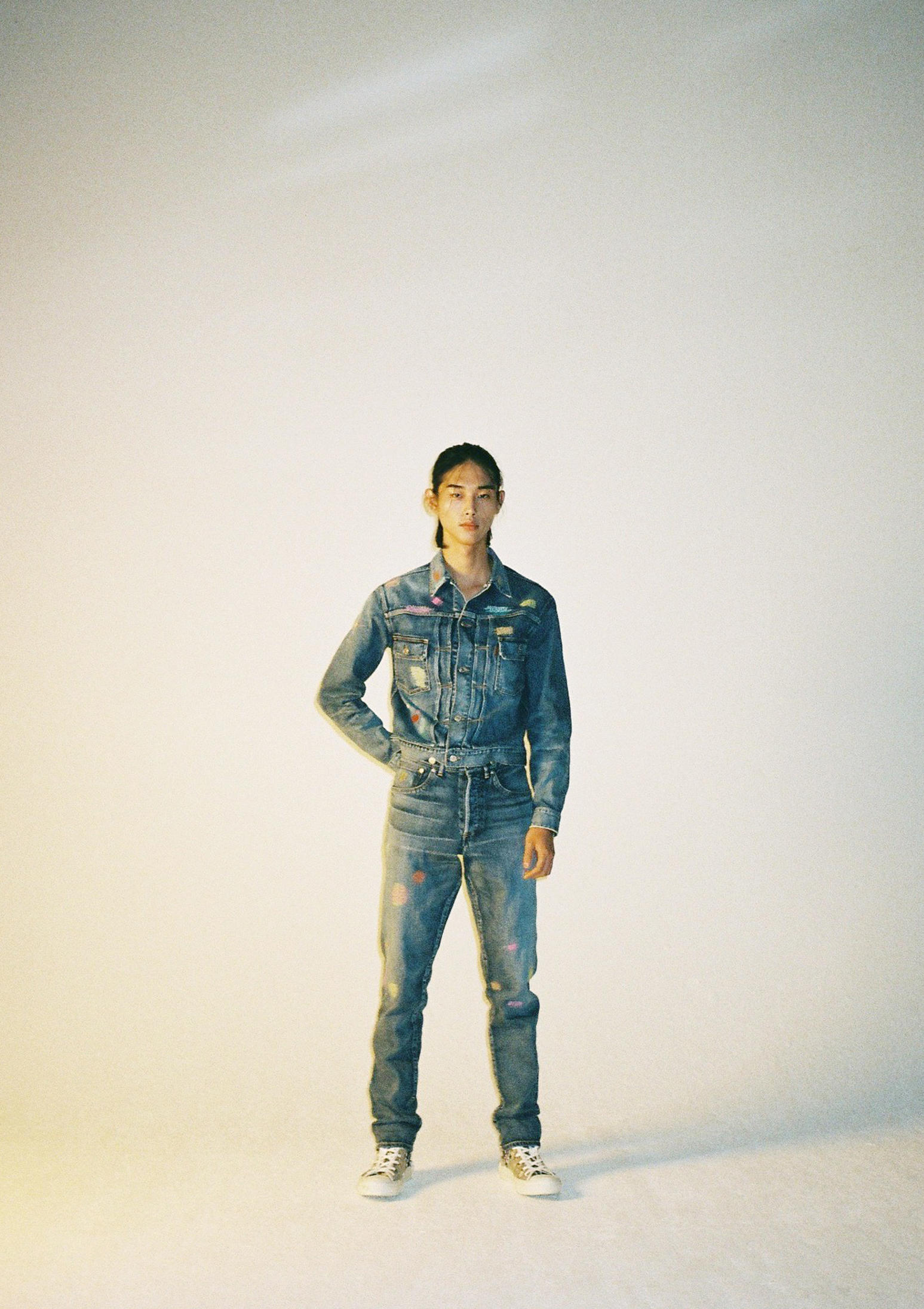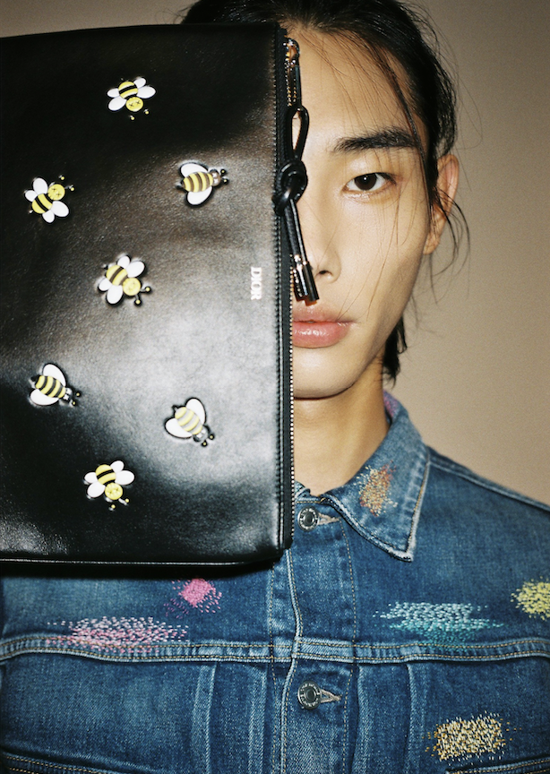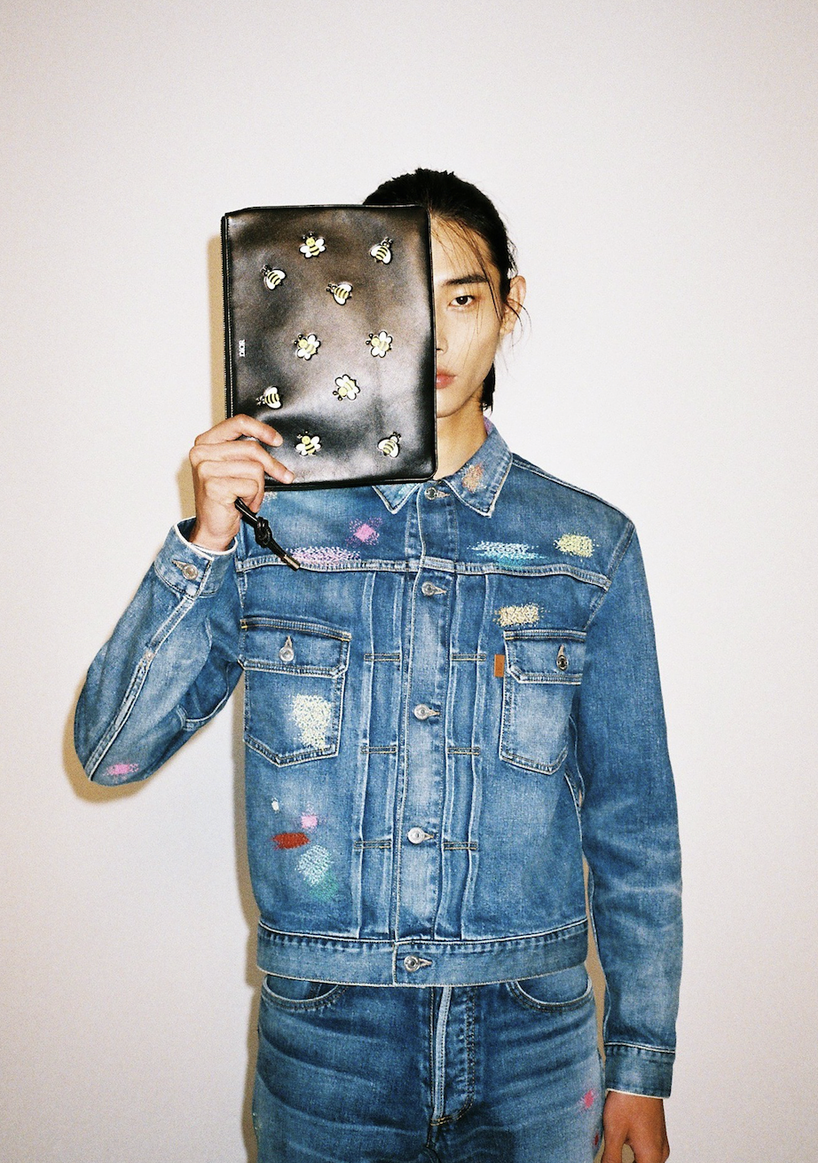 BORO 자수 장식의 블루 데님 자켓과 팬츠, DIOR KAWS BEE 블랙 파우치는 디올 맨(Dior Men).