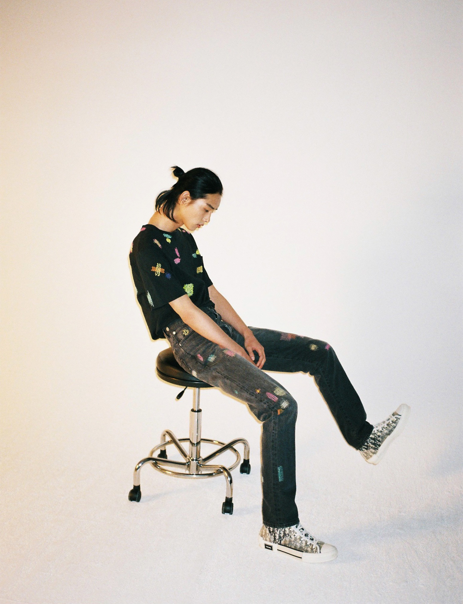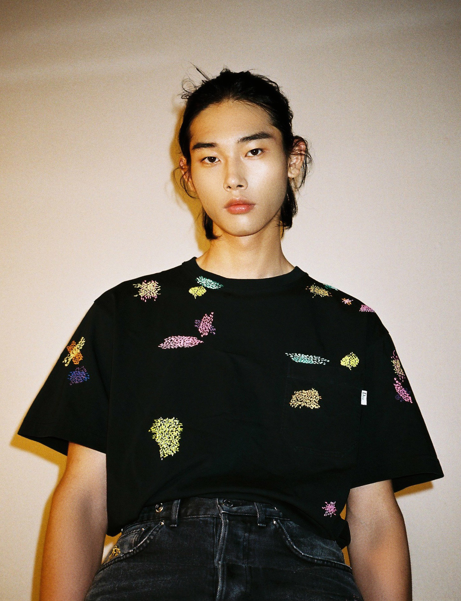 컬러풀한 BORO 자수 장식의 블랙 티셔츠와 재피니즈 셀비지 데님 팬츠는 디올 맨(Dior Men)