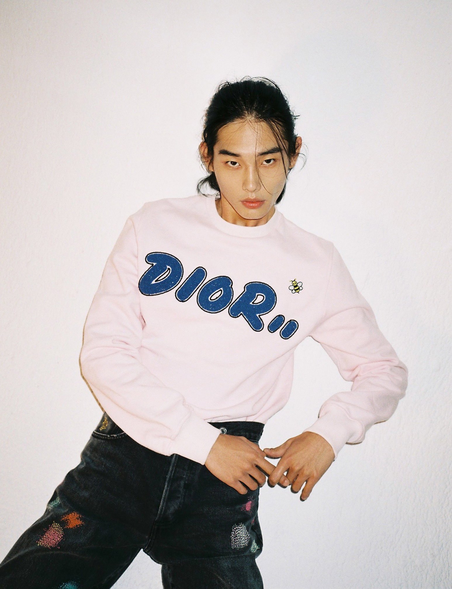 DIOR KAWS BEE 핑크 스웨트 셔츠와 BORO 자수 장식의 재피니즈 셀비지 데님 팬츠는 디올 맨(Dior Men).