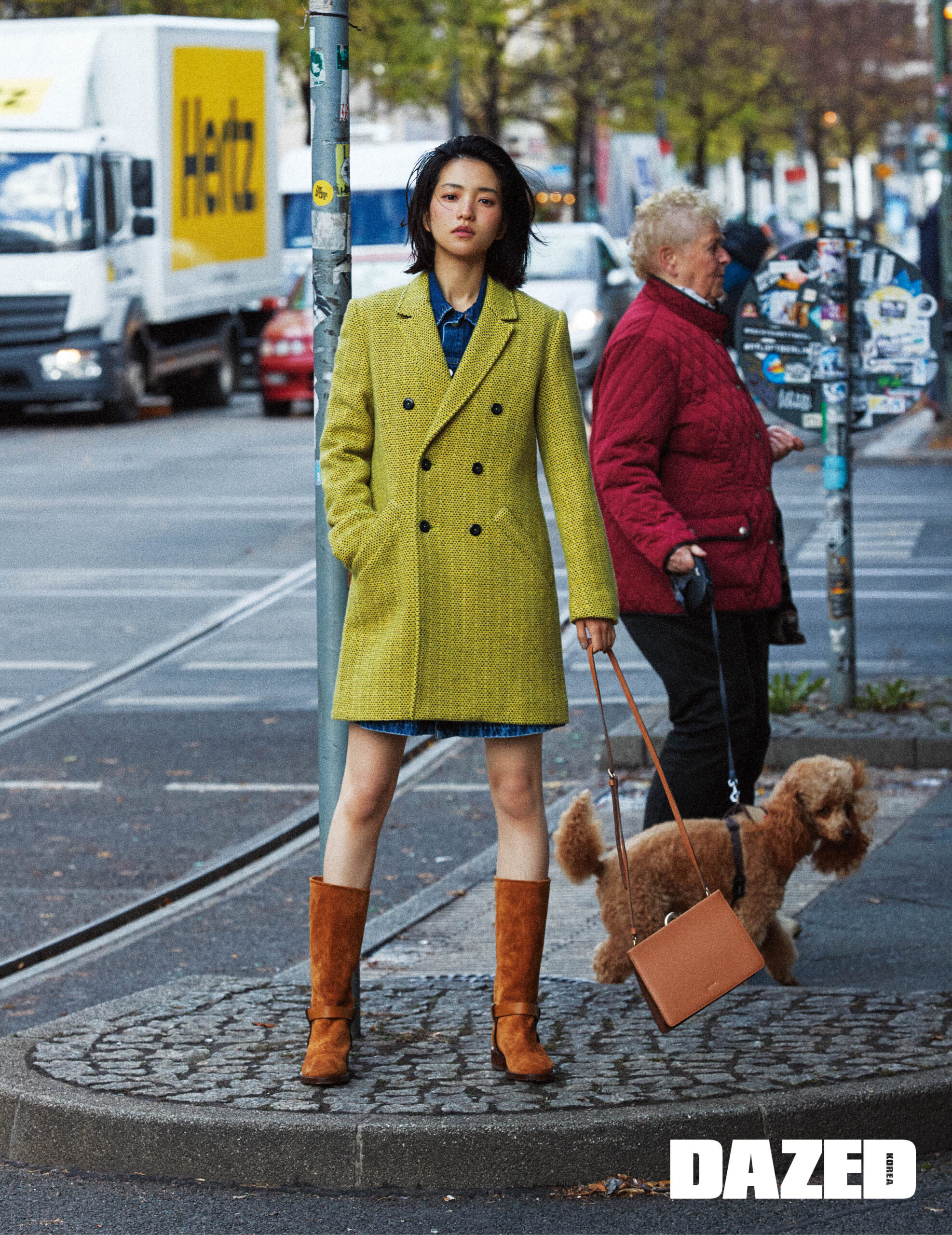 백은 제이에스티나 핸드백(J. ESTINA BAG), 코트는 아페쎄(A.P.C.), 이너로 입은 데님 원피스는 캘빈 클라인 진(Calvin Klein Jeans) , 부츠는 스튜어트 와이츠먼(Stuart Weitzman)
