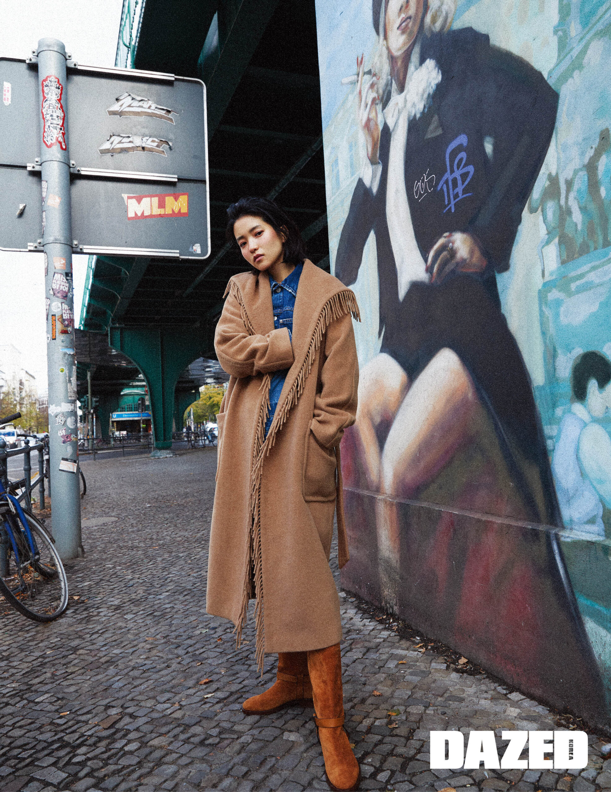 프린지 코트는 막스마라(Maxmara), 이너로 입은 데님 원피스는 캘빈 클라인 진(Calvin Klein Jeans), 부츠는 스튜어트 와이츠먼(Stuart Weitzman).