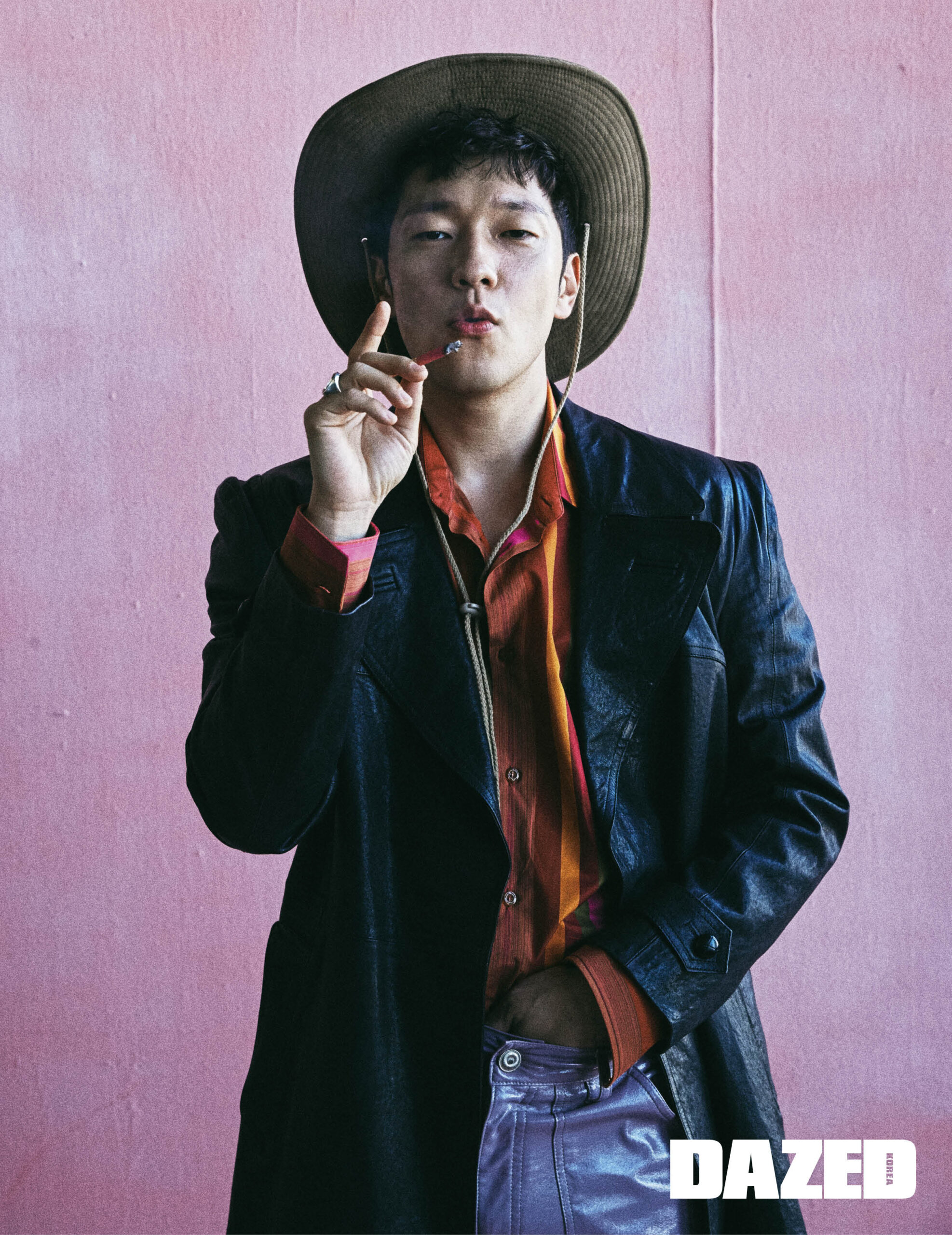 오버사이즈 재킷은 윈도우 00(Window 00), 실크 셔츠는 비비안 웨스트우드(Vivienne Westwood), 레더 팬츠는 오디너리 피플(Ordinary People), 웨스턴 부츠와 모자는 스타일리스트의 것.