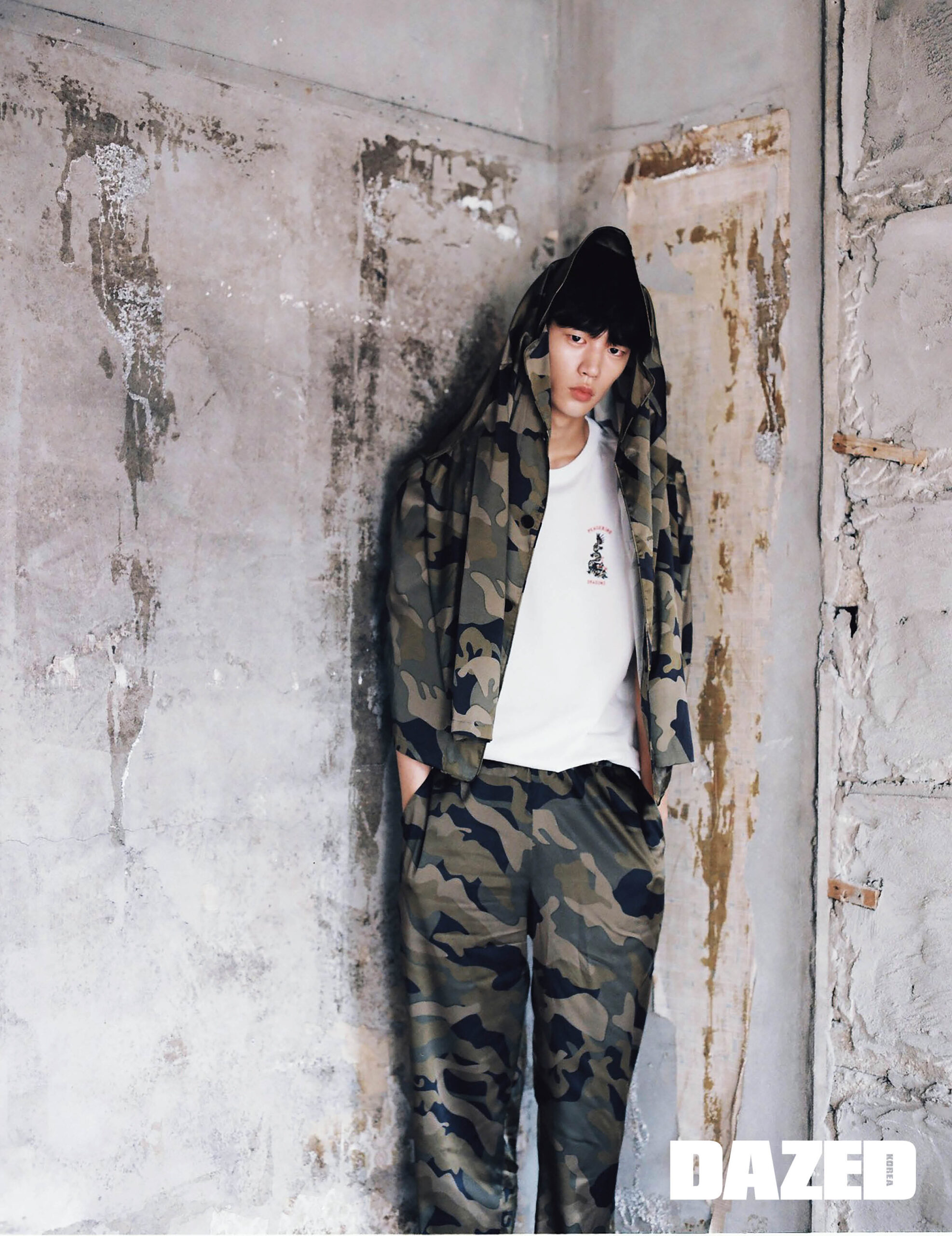 카무플라주 패턴 셔츠와 팬츠, 이너로 입은 화이트 반팔 톱은 모두 피스버드 맨(Peacebird Men).