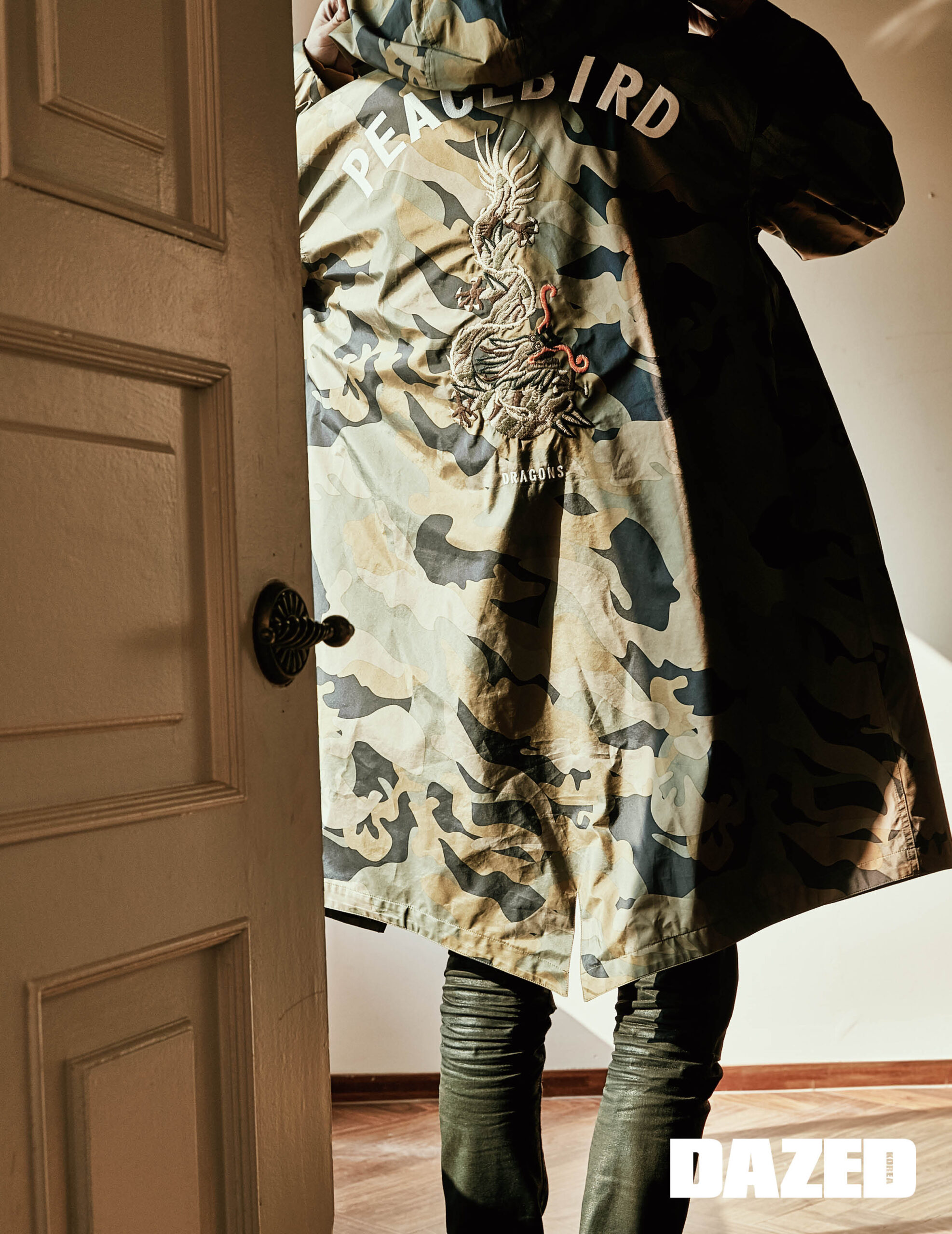 카무플라주 패턴 레인코트는 피스버드 맨(Peacebird Men), 블랙 팬츠는 에디터의 것.