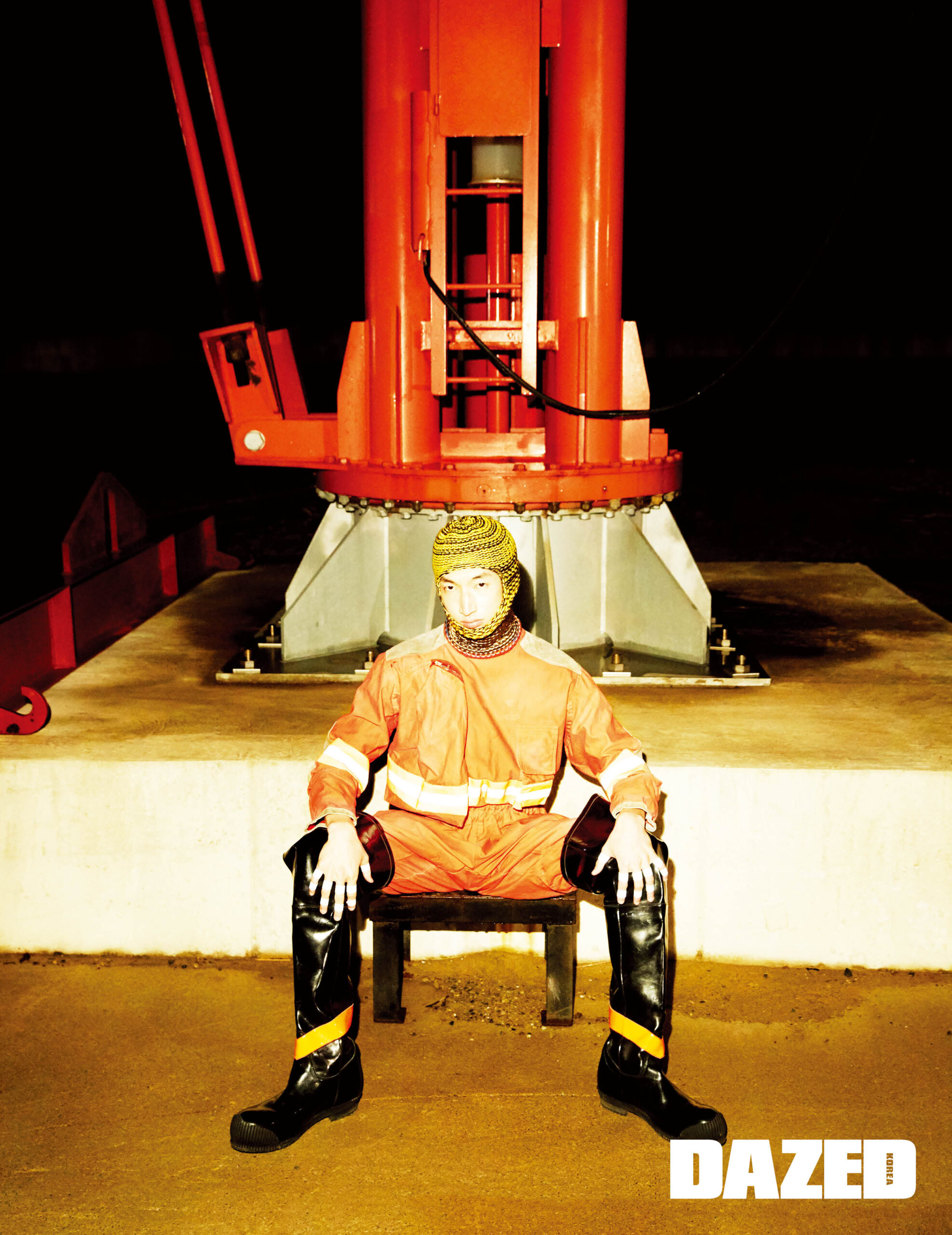 소방복을 닮은 점프슈트와 장화, 발라클라바는 모두 캘빈 클라인 205W39NYC(Calvin Klein 205W39NYC).