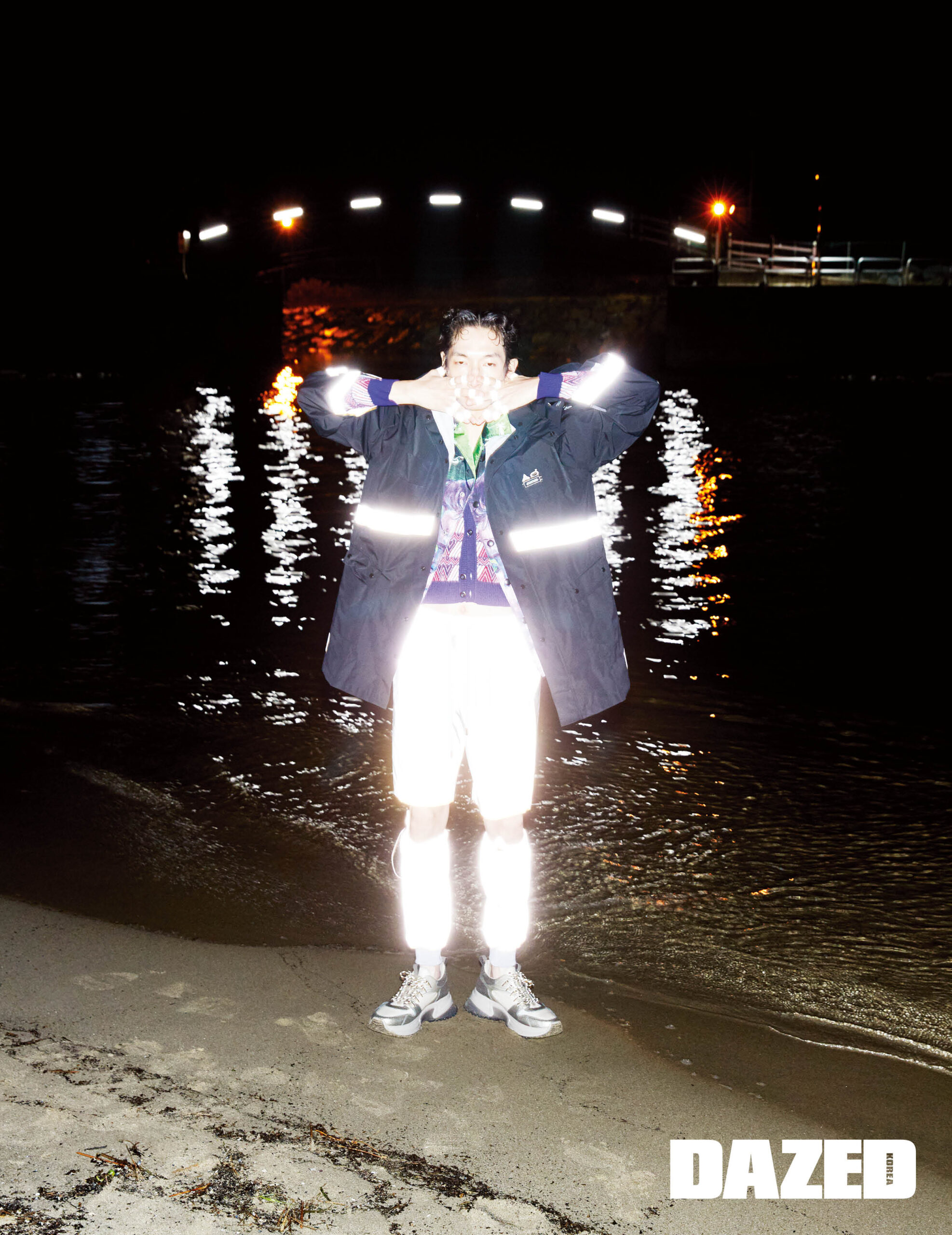 반사 테이프가 붙은 점퍼는 젠틀 몬스터 X 젠더 주(Gentle Monster X Xander Zhou), 안에 입은 셔츠와 니트는 프라다(Prada), 빛 반사 소재의 팬츠는 뮌(Munn), 다리에 착용한 레그 워머는 포스트 아카이브 팩션(PAF), 스니커즈는 루이 비통(Louis Vuitton).