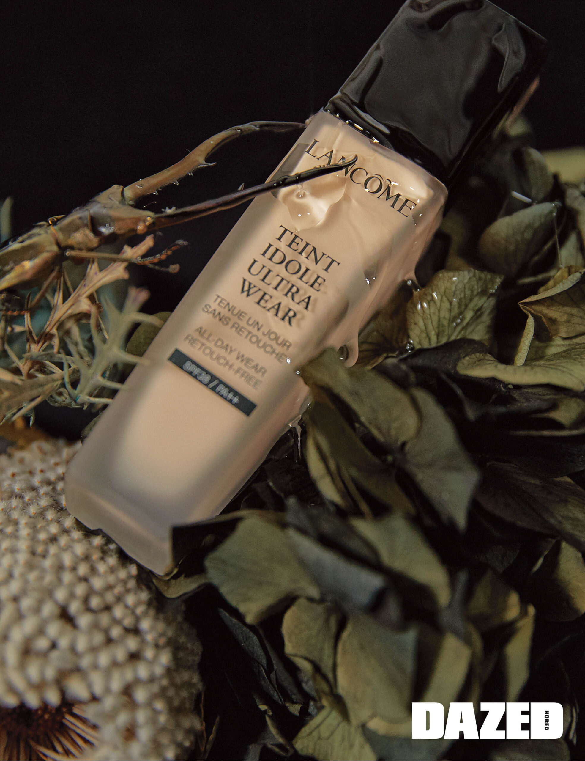 무너지지 않는 지속력이 장점인 랑콤 뗑 이돌 울트라 웨어 파운데이션. 입술에 바른 컬러는 랑콤 압솔뤼 루즈 쉬어 #264.
