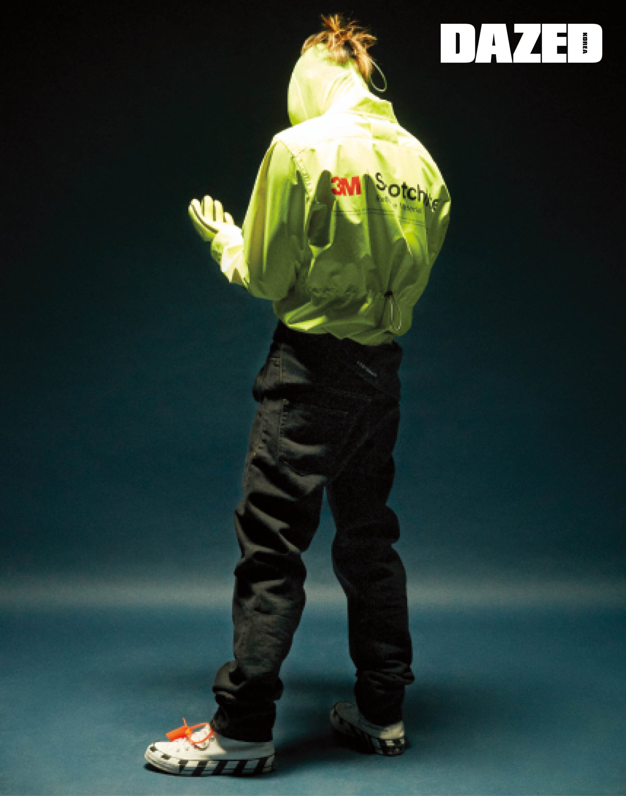 네온 컬러 복면과 3M 레터링 톱, 장갑은 모두 뮌(Munn), 커스텀한 데님 팬츠는 와이프로젝트 by 아이코스튬(Y/Project by Ikoes.tume), 스니커즈는 식케이의 것.