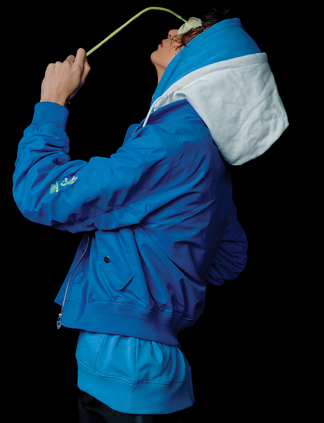 후드가 달린 보머 채킷과 이너로 입은 후드 톱은 피스버드맨(Peacebird Men).