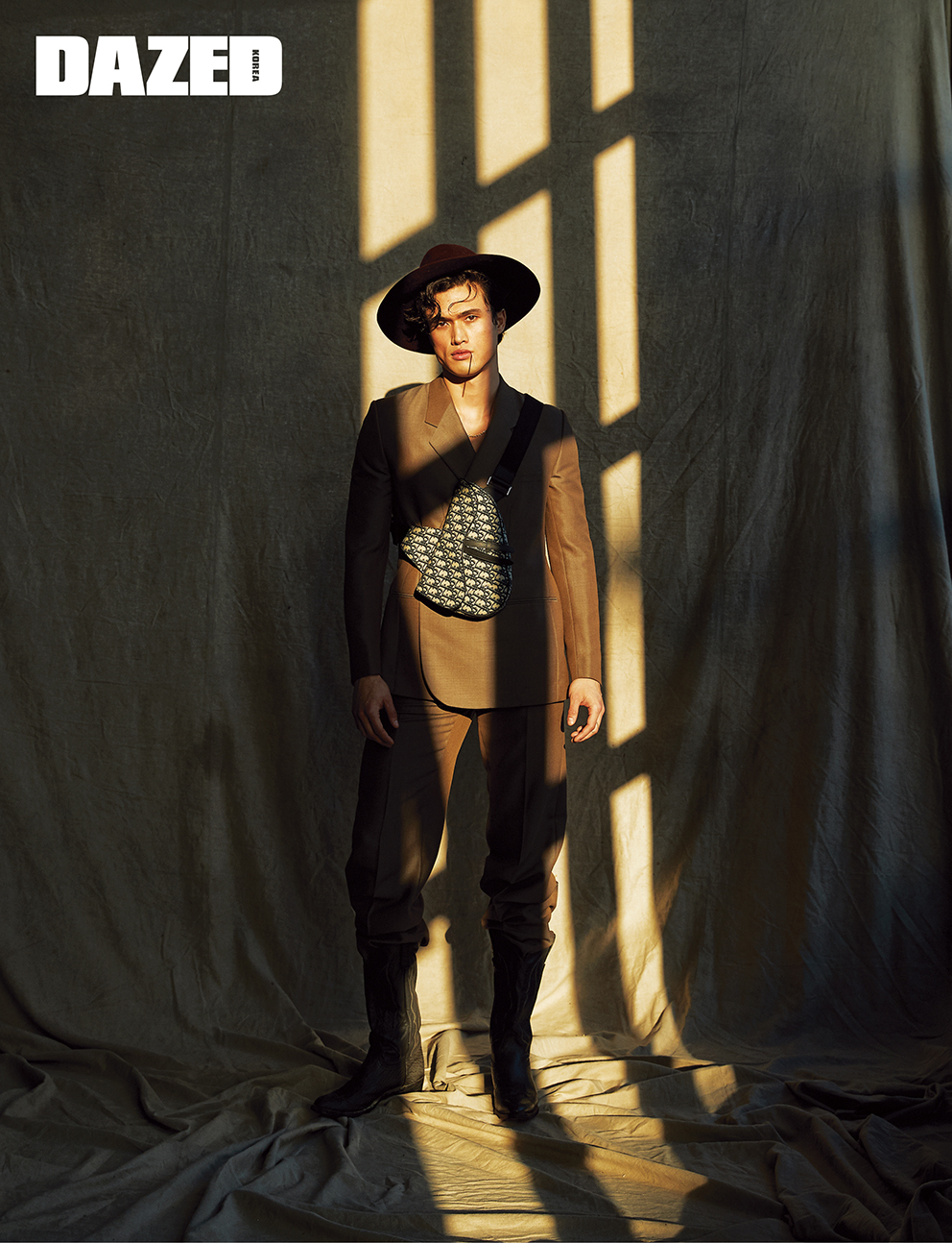 간결한 실루엣의 슈트와 로고 패턴 새들 백은 디올 맨(Dior Men), 자수 디테일의 페도라는 헬렌 카민스키(Helen Kaminski), 골드 네크리스는 찰스 멜턴의 것, 웨스턴 부츠는 스타일리스트의 것.