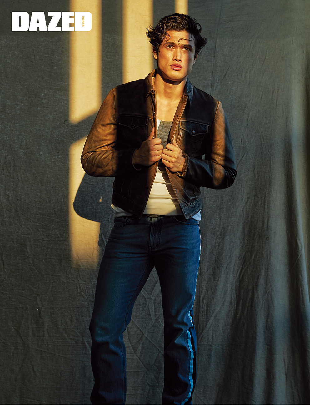 앤디 워홀의 작품을 프린트한 슬리브리스톱과 라이닝 포인트의 데님 팬츠는 캘빈 클라인 진(Calvin Klein Jeans), 터프한 무드의 레더 재킷은 리바이스(Levi’s), 웨스턴 무드의 버클이 돋보이는 벨트는 우영미(WOOYOUNGMI).