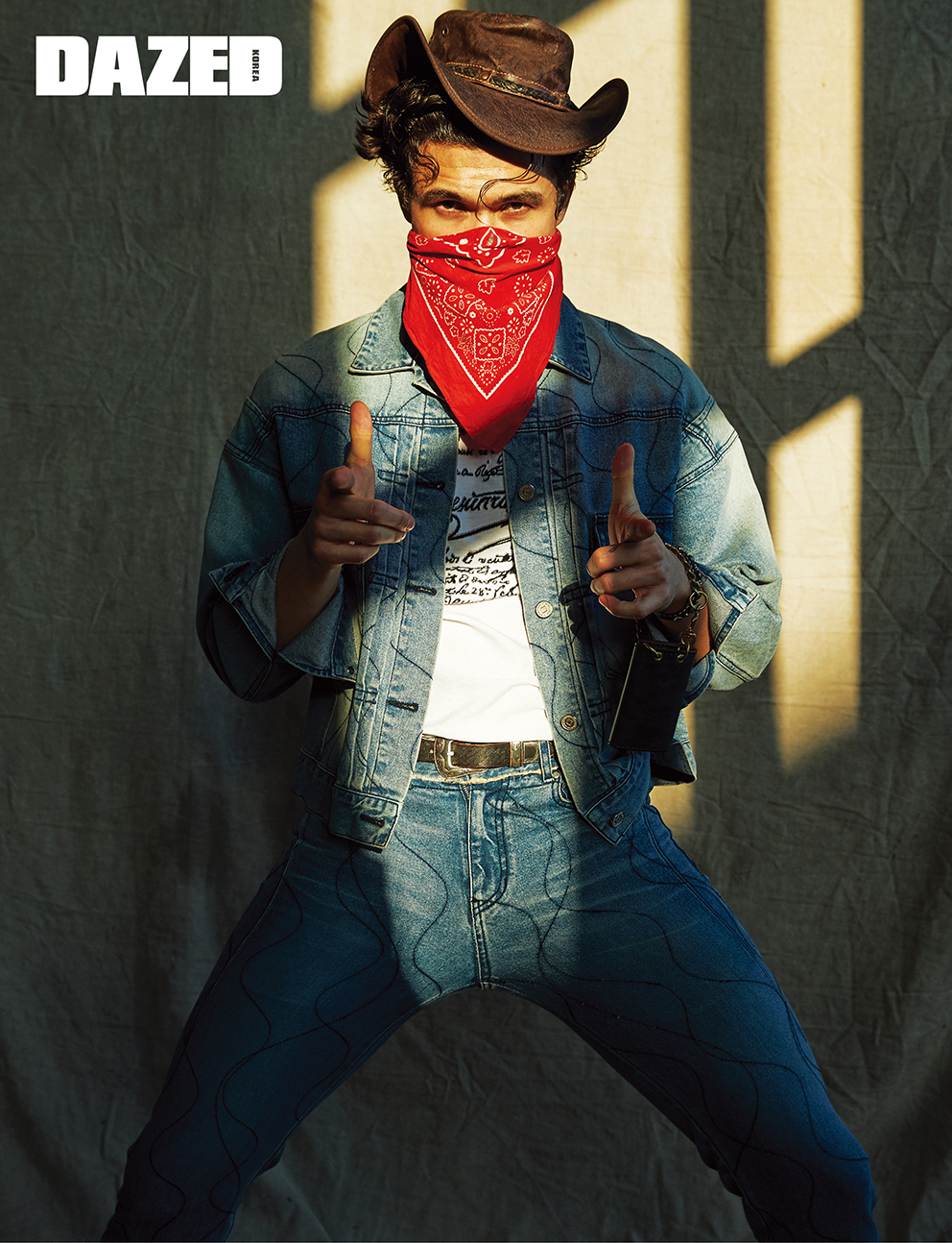 자수로 레터링한 티셔츠는 벨루티(Berluti), 라이닝 디테일의 데님 재킷과 팬츠, 화이트 컬러 웨스턴 부츠는 모두 우영미(WOOYOUNGMI),