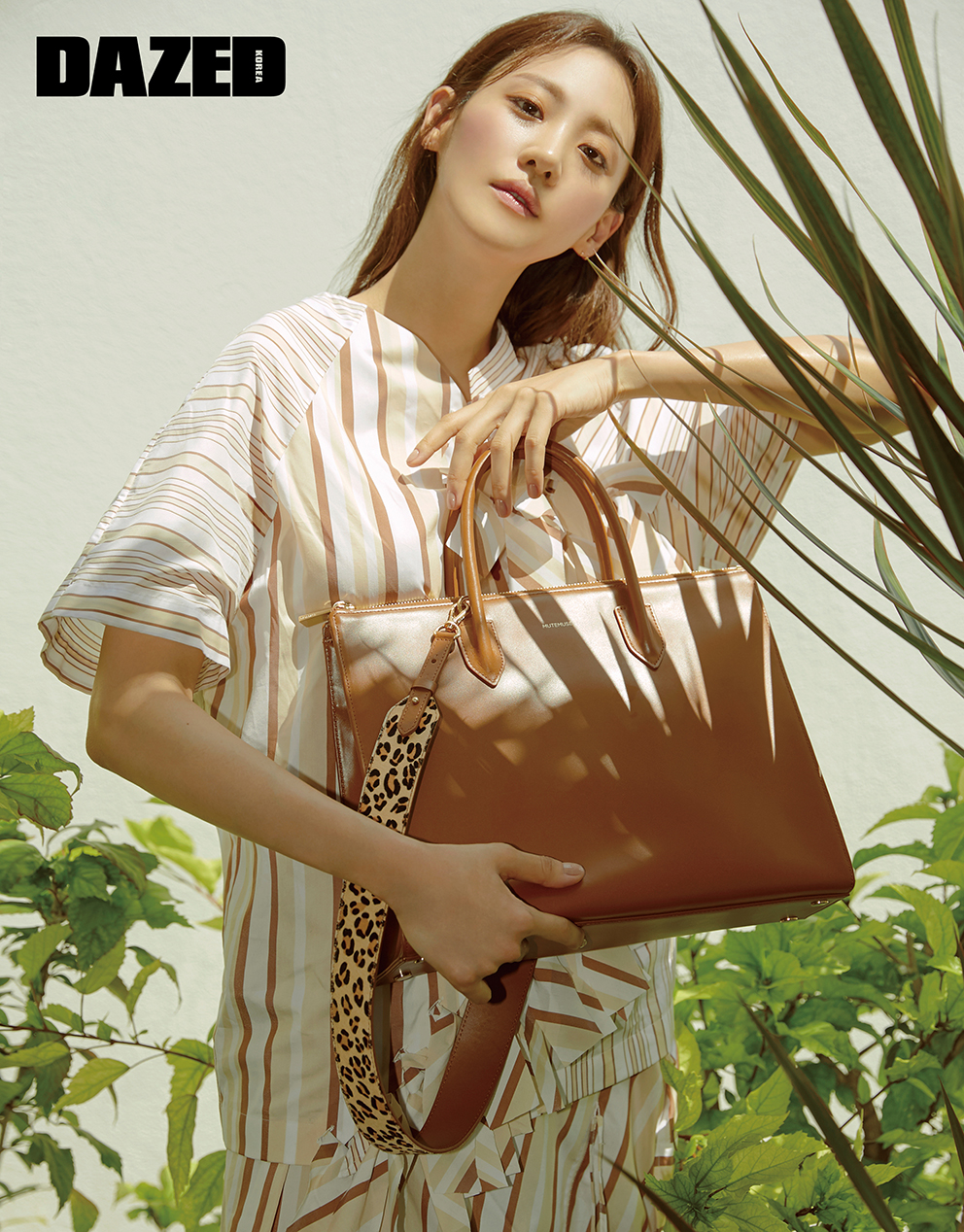 브라운 컬러의 사각 토트백은 뮤트뮤즈(Mutemuse), 브라운 스트라이프 패턴의 셔츠 원피스는 포츠 1961(Ports 1961).