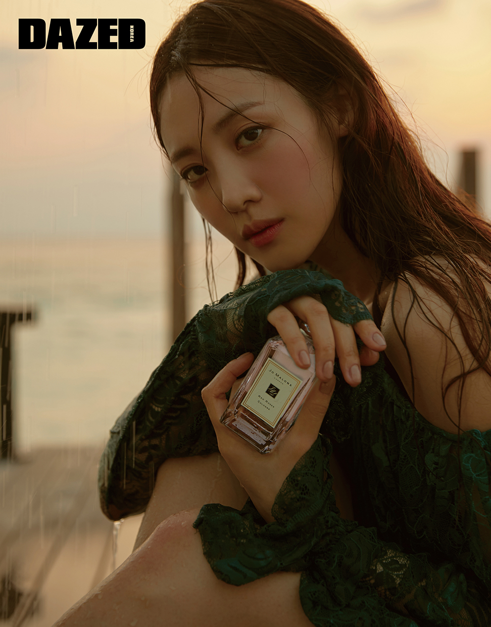 맑고 싱그러운 일곱 가지 생장미의 향기를 담은 레드 로즈 코롱은 조 말론 런던(Jo Malone London), 그린 컬러의 레이스 톱과 팬츠는 비비안 웨스트우드(Vivienne Westwood).