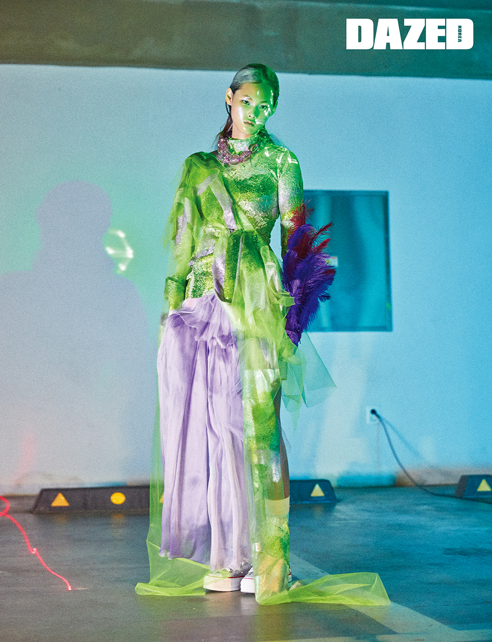 글리터가 돋보이는 연두색 레이스 드레스와 깃털 장식 장갑은 X 제르마니에 익스클루시브(Germanier), 시폰 소재의 스커트와 네크리스는 제르마니에(Germanier), 스니커즈는 컨버스(Converse), 양말은 에디터의 것.