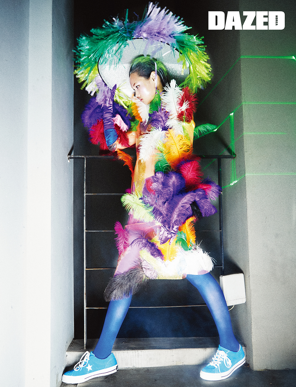 깃털이 돋보이는 미디 드레스와 보라색 장갑, 프린지 디테일의 헤드피스는 <데이즈드> X 제르마니에 익스클루시브(Germanier), 스니커즈는 컨버스(Converse), 파란색 스타킹은 에디터의 것.