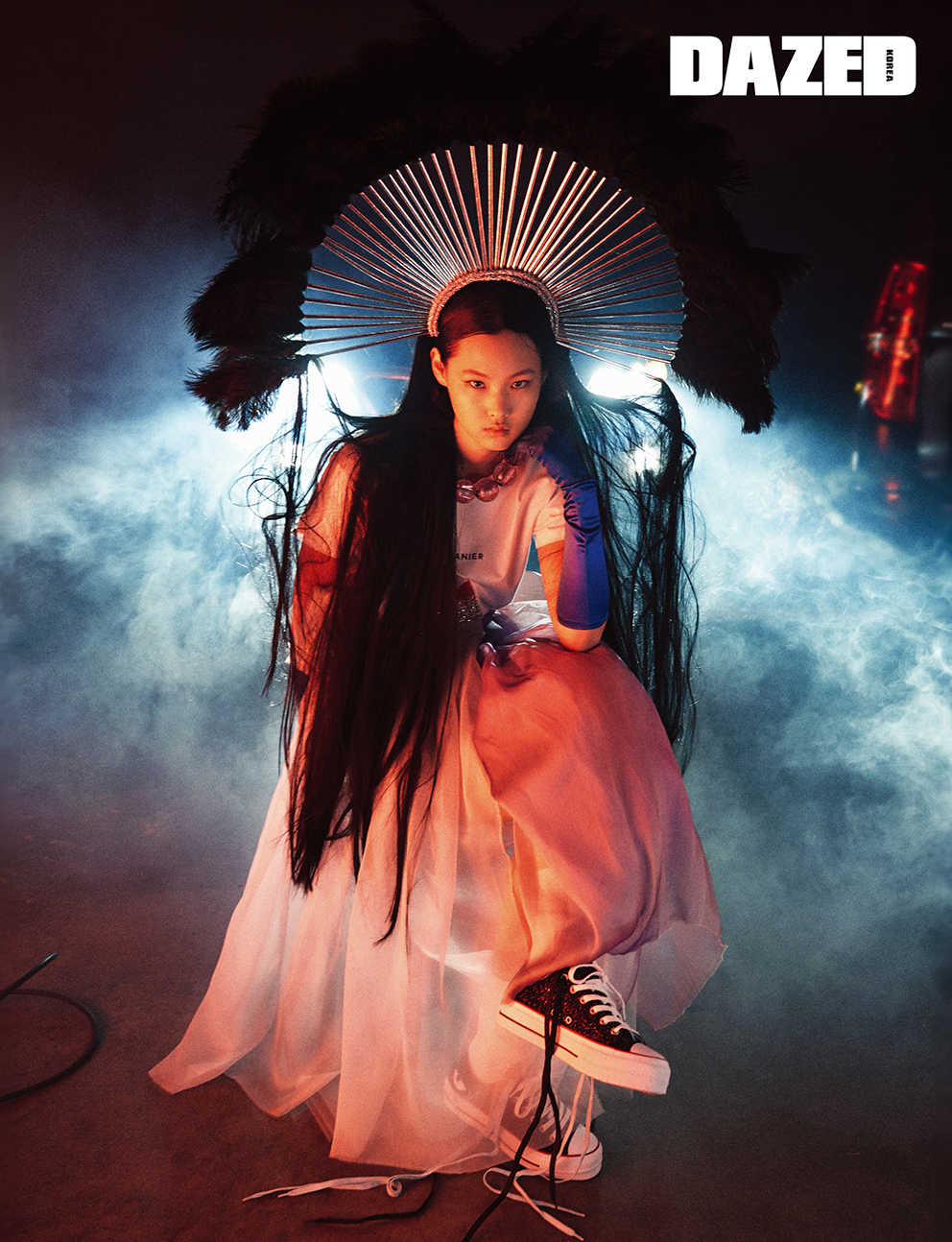 로고 프린트 티셔츠와 시폰 소재의 스커트, 볼드한 투명 구슬 네크리스, 보라색 장갑은 모두 제르마니에(Germanier), 커다란 깃털을 장식한 헤드피스는 <데이즈드>X제르마니에 익스클루시브(Germanier), 스니커즈는 컨버스(Converse).