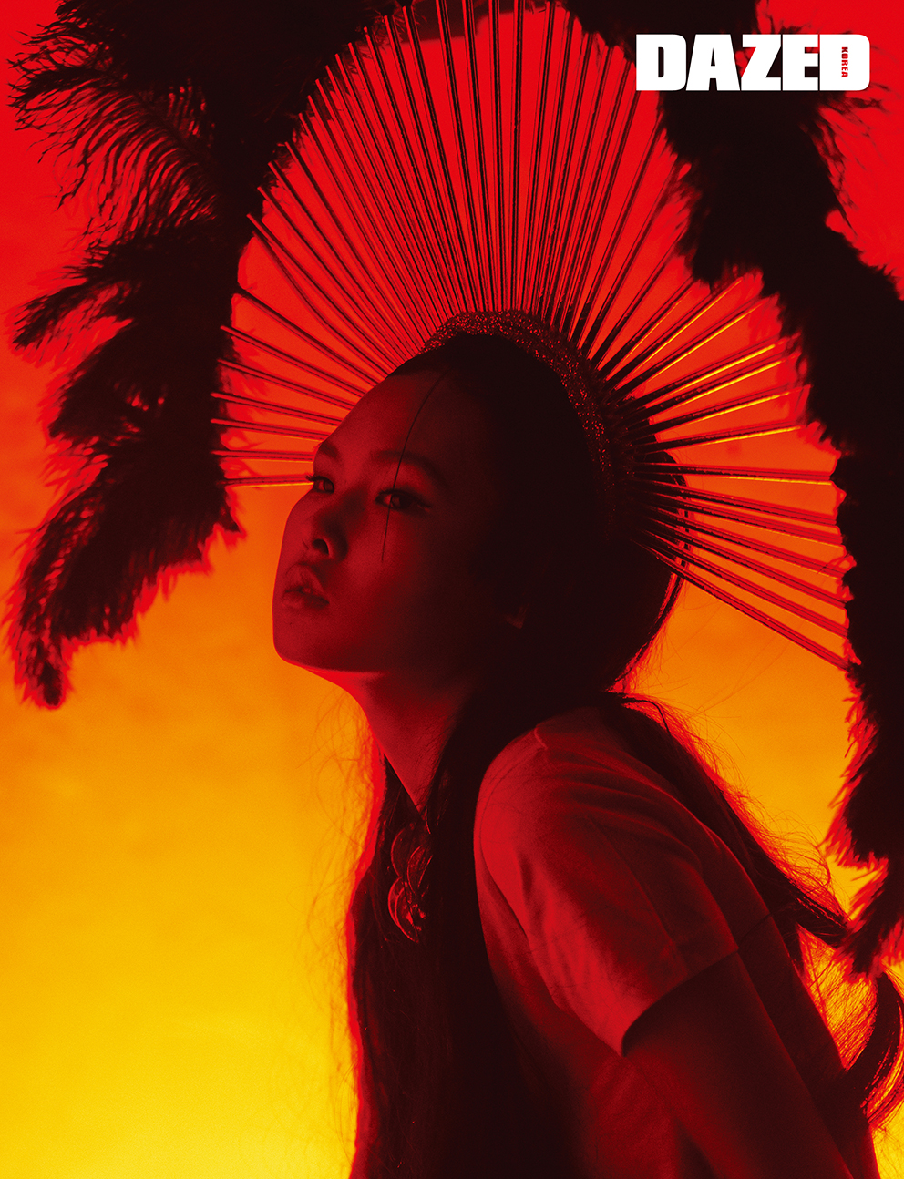 티셔츠와 네크리스는 제르마니에(Germanier), 깃털을 장식한 헤드피스는 <데이즈드>X제르마니에 익스클루시브(Germanier).